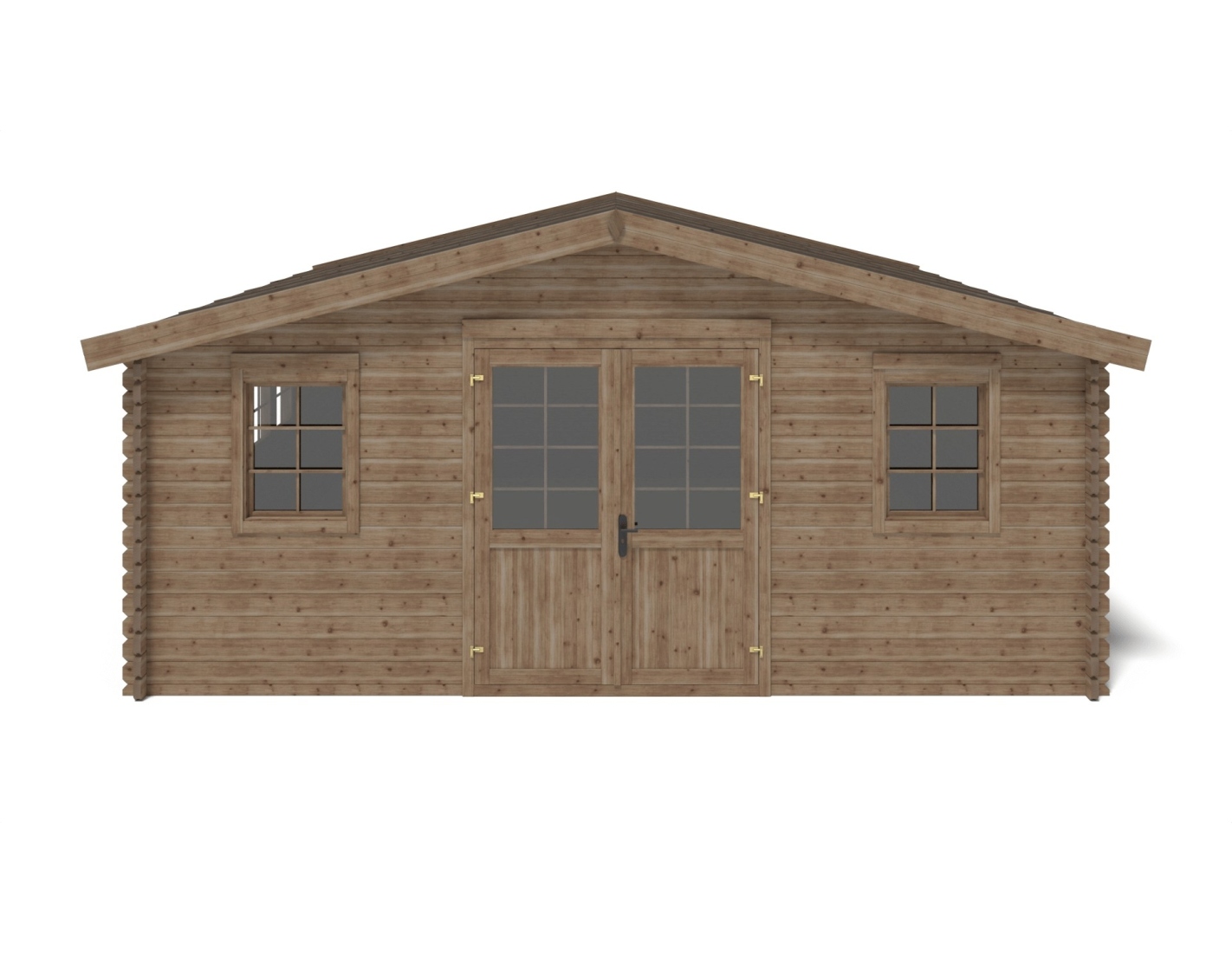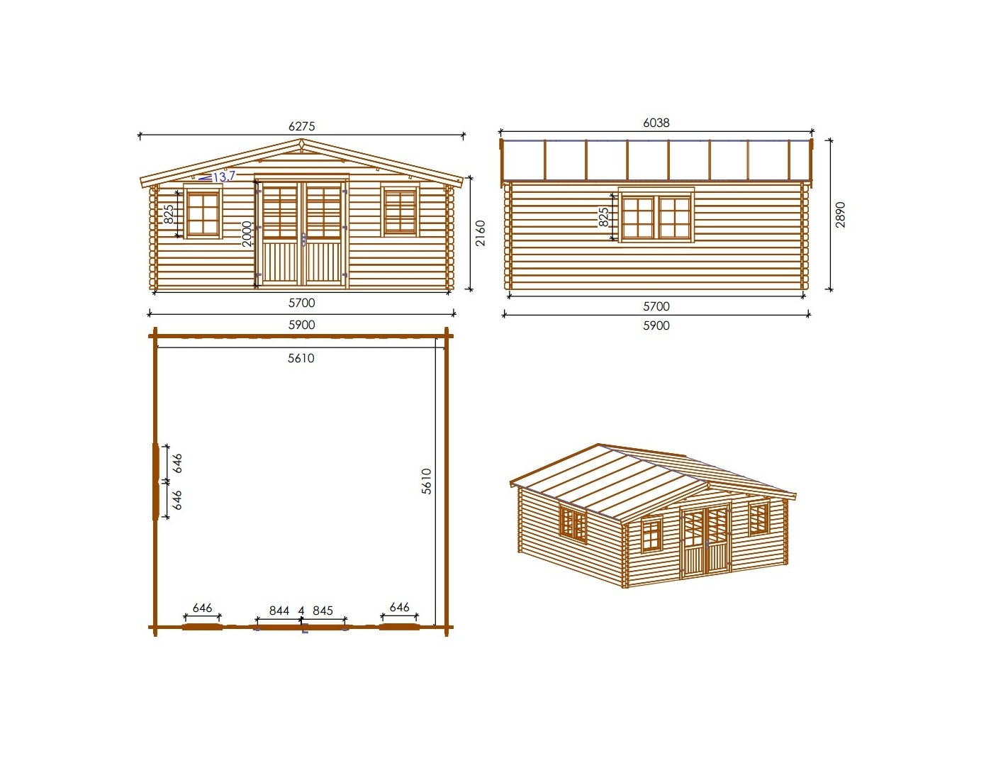 Sur les photos, il y a un chalet en bois DOM656 d'une superficie de 34.8m2. Dimensions au sol : L 5.9m et P 5.9m.