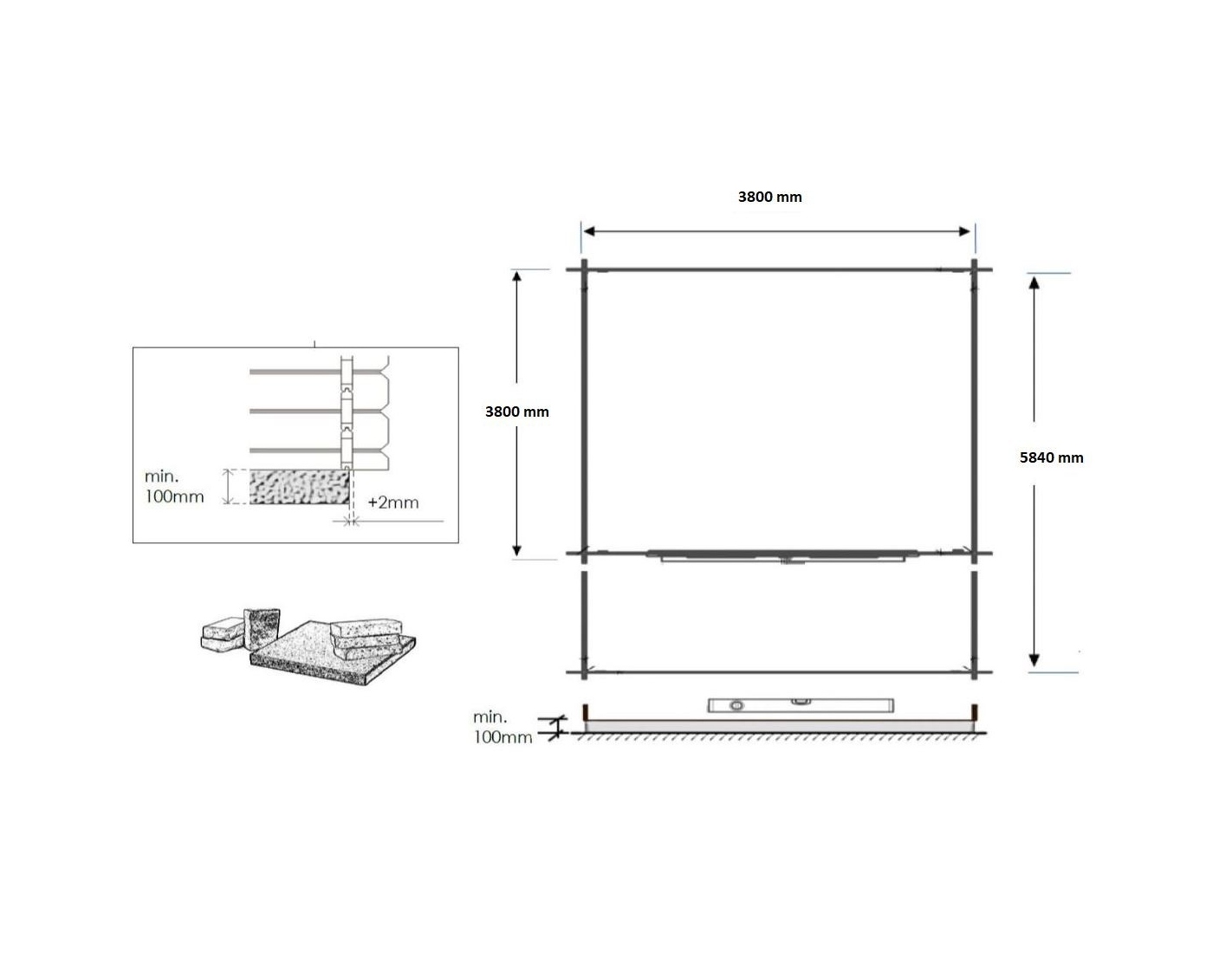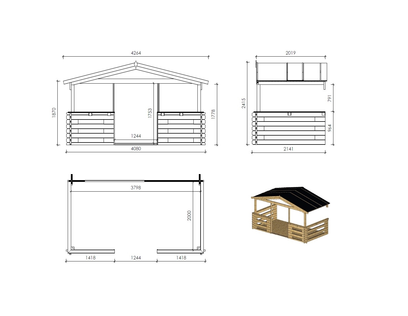 Abri + terrasse et avant-toit - abri d'une superficie de 24 m2, une largeur de façade de 4 m, une profondeur de 4 m et une épaisseur de parois de 40 mm.