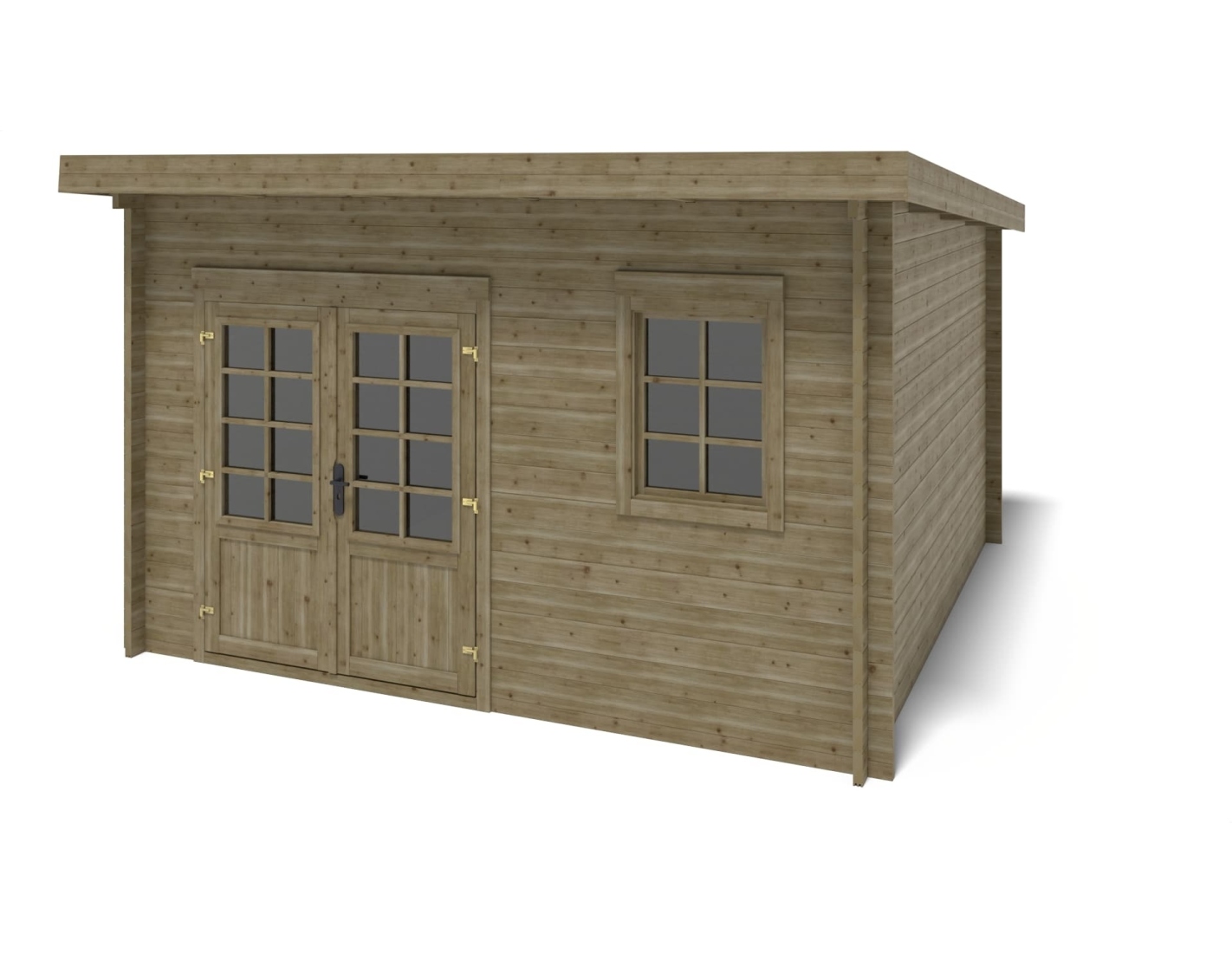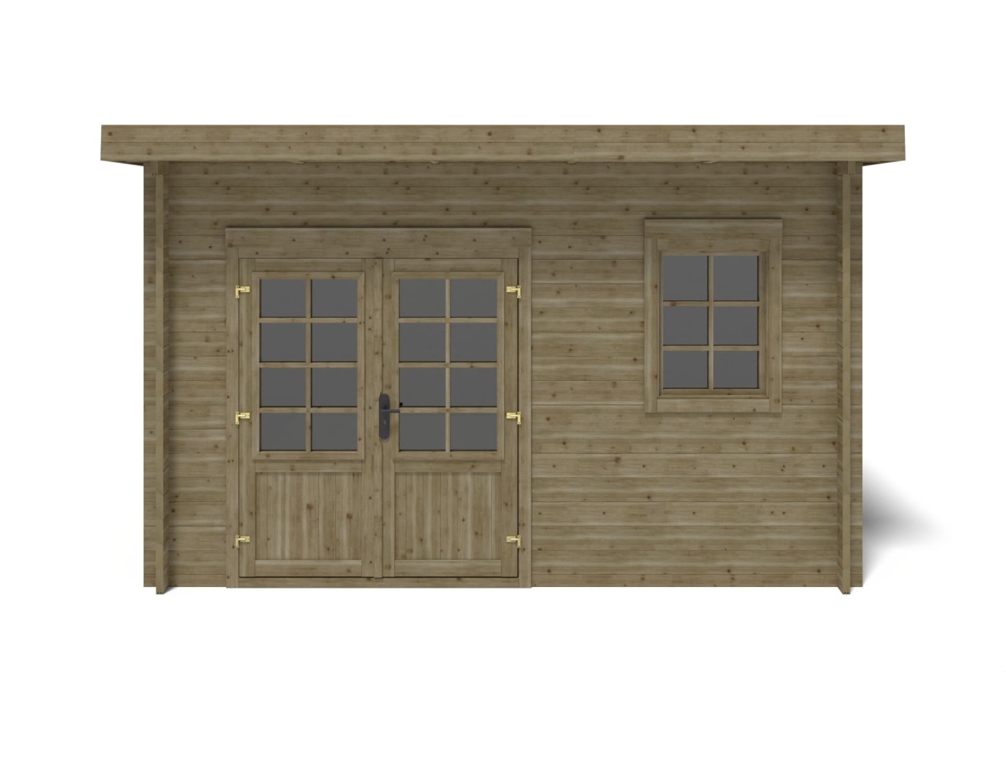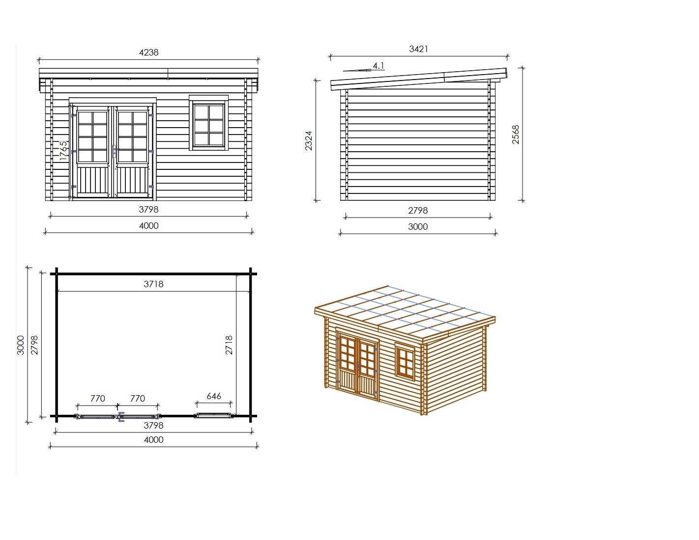 Sur les photos, il y a un chalet en bois DOM717 d'une superficie de 12m2. Dimensions au sol : L 4m et P 3m.