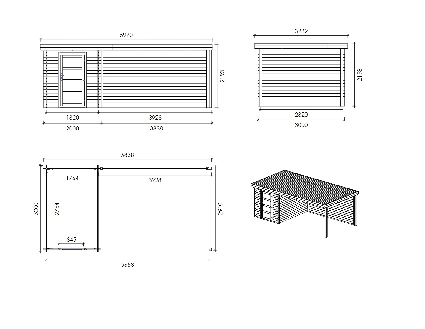 Sur les photos, il y a un chalet en bois DOM695 d'une superficie de 6m2. Dimensions au sol : L 5.84m et P 3m.