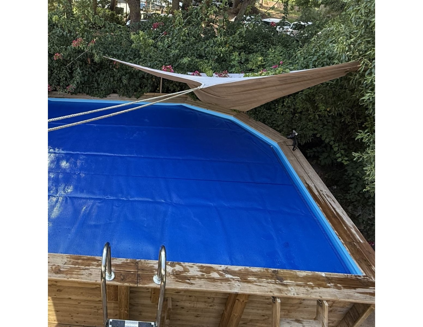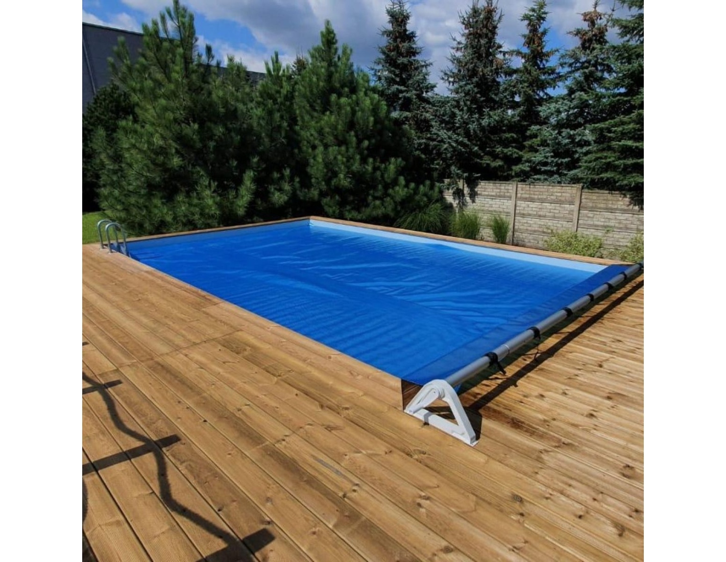 Bâche d'été à bulles pour piscine, découpée selon la forme et les dimensions intérieures de la piscine.Polyéthylène 400 µCouleur bleu foncéLes bords de la bâche sont cousus et durables.