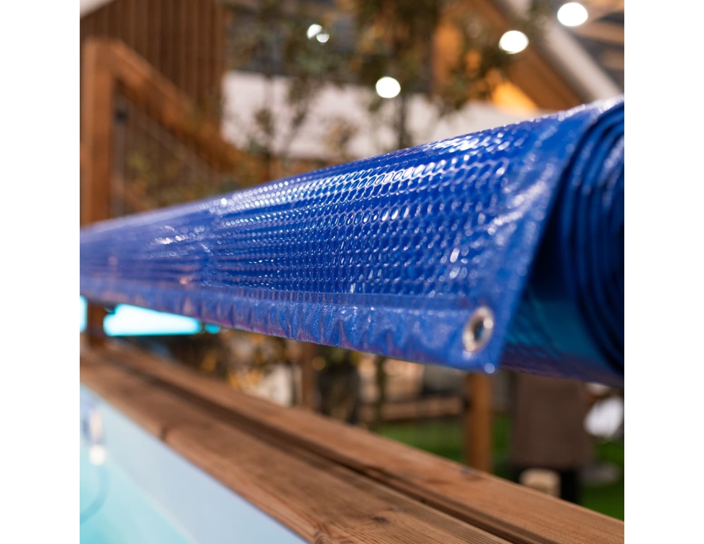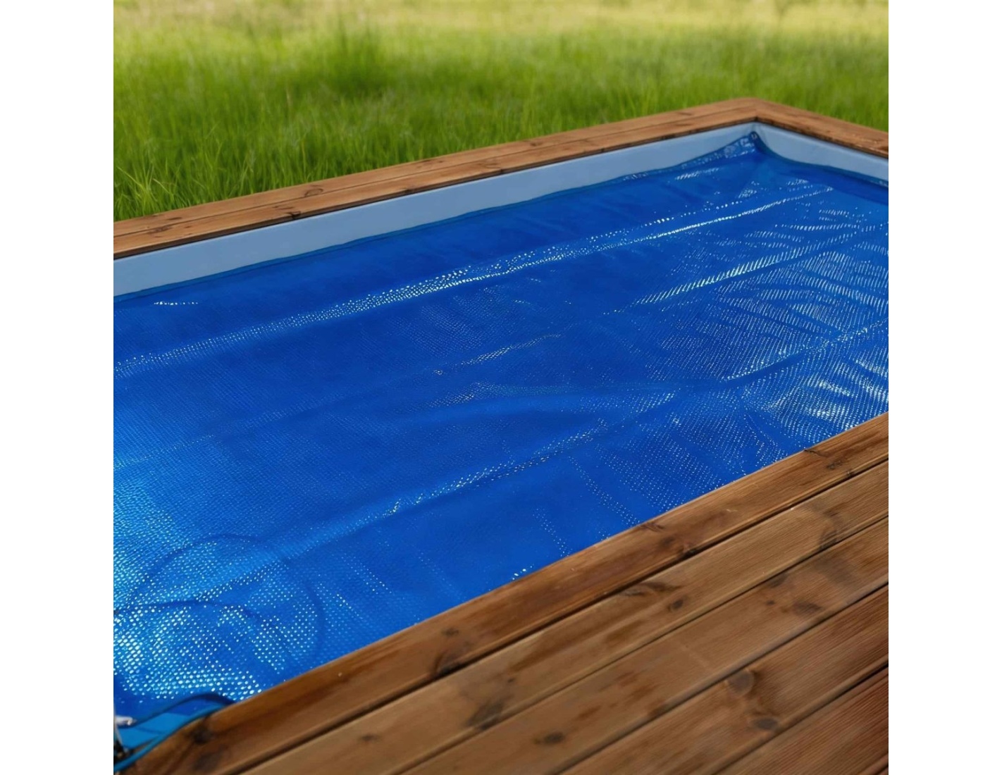Bâche d'été à bulles pour piscine, découpée selon la forme et les dimensions intérieures de la piscine.Polyéthylène 400 µCouleur bleu foncéLes bords de la bâche sont cousus et durables.