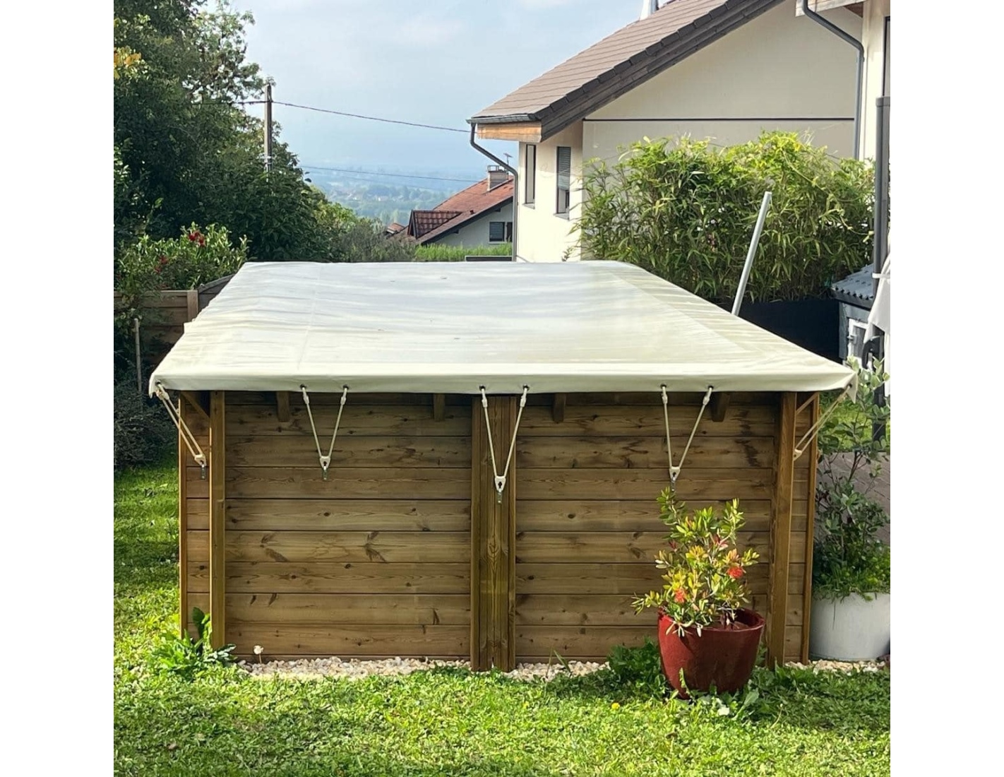 Bâche d’hiver pour piscine bois, fabriquée en PVC de haute qualité, avec traitement anti-UV et antifongique.