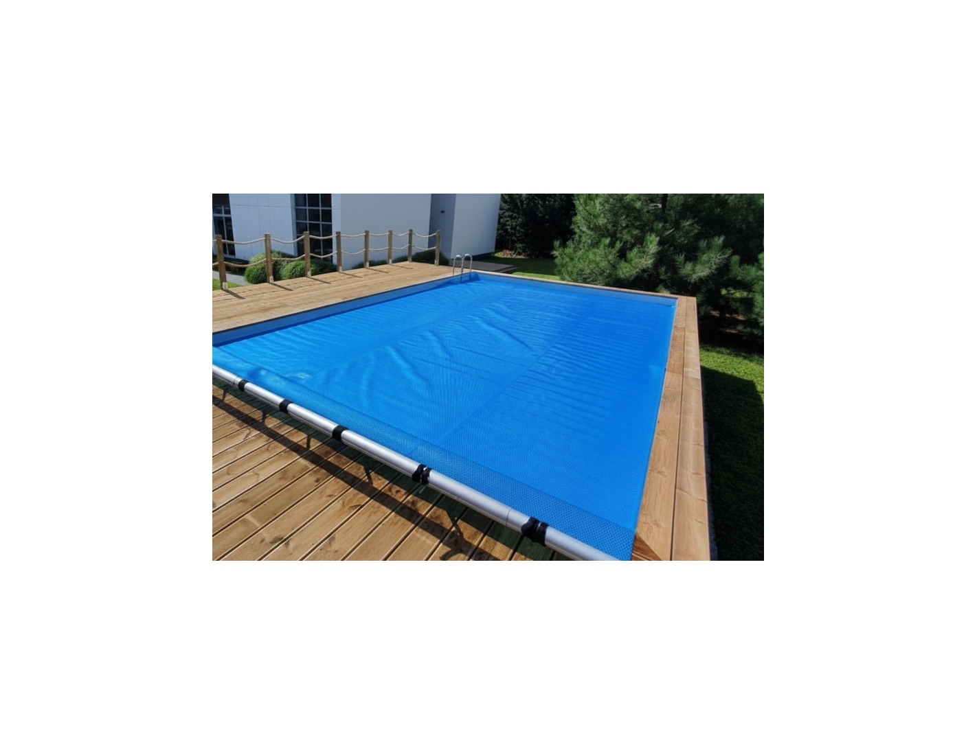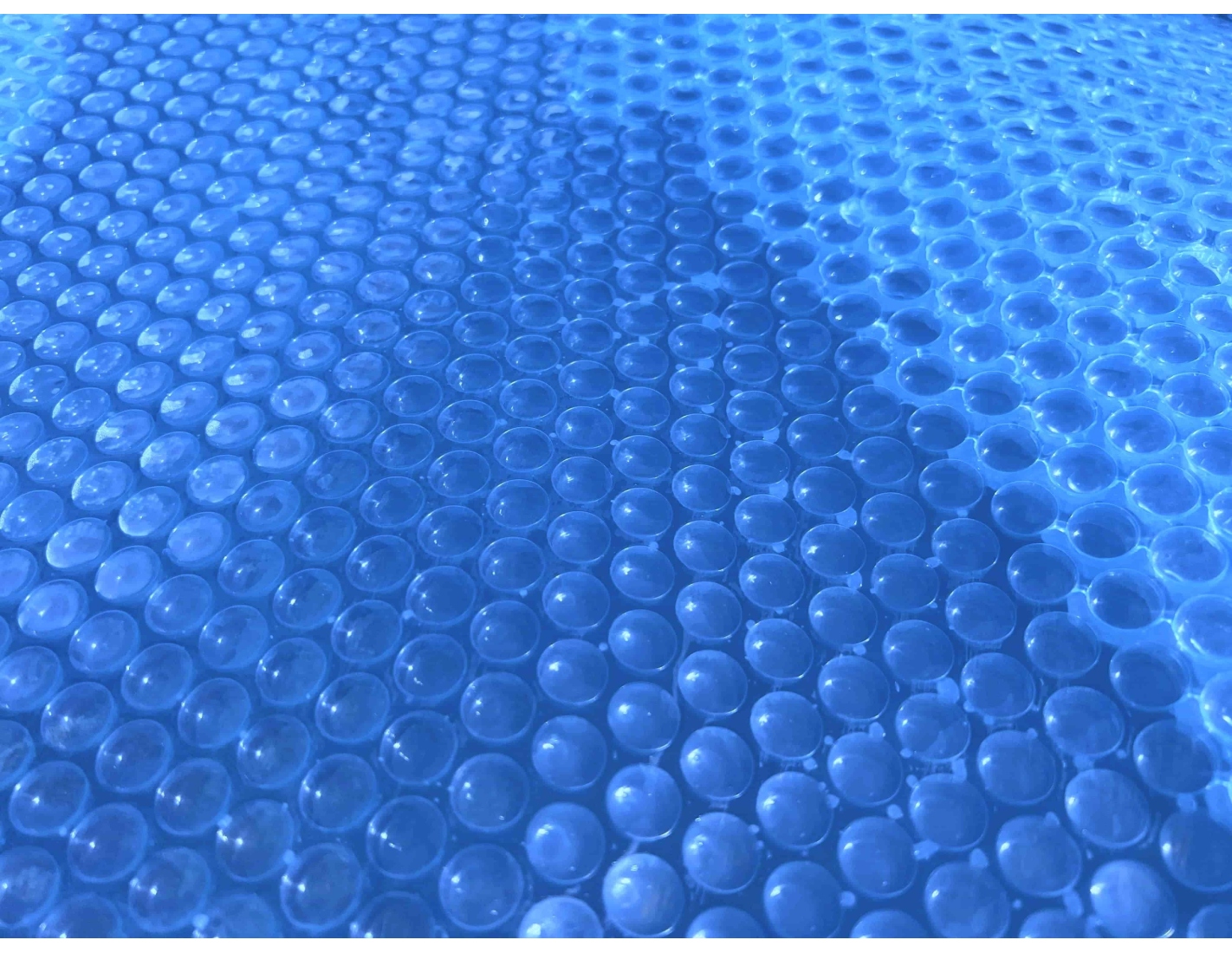 Bâche d'été à bulles pour piscine, découpée selon la forme et les dimensions intérieures de la piscine.Polyéthylène 400 µCouleur bleu foncéLes bords de la bâche sont cousus et durables.