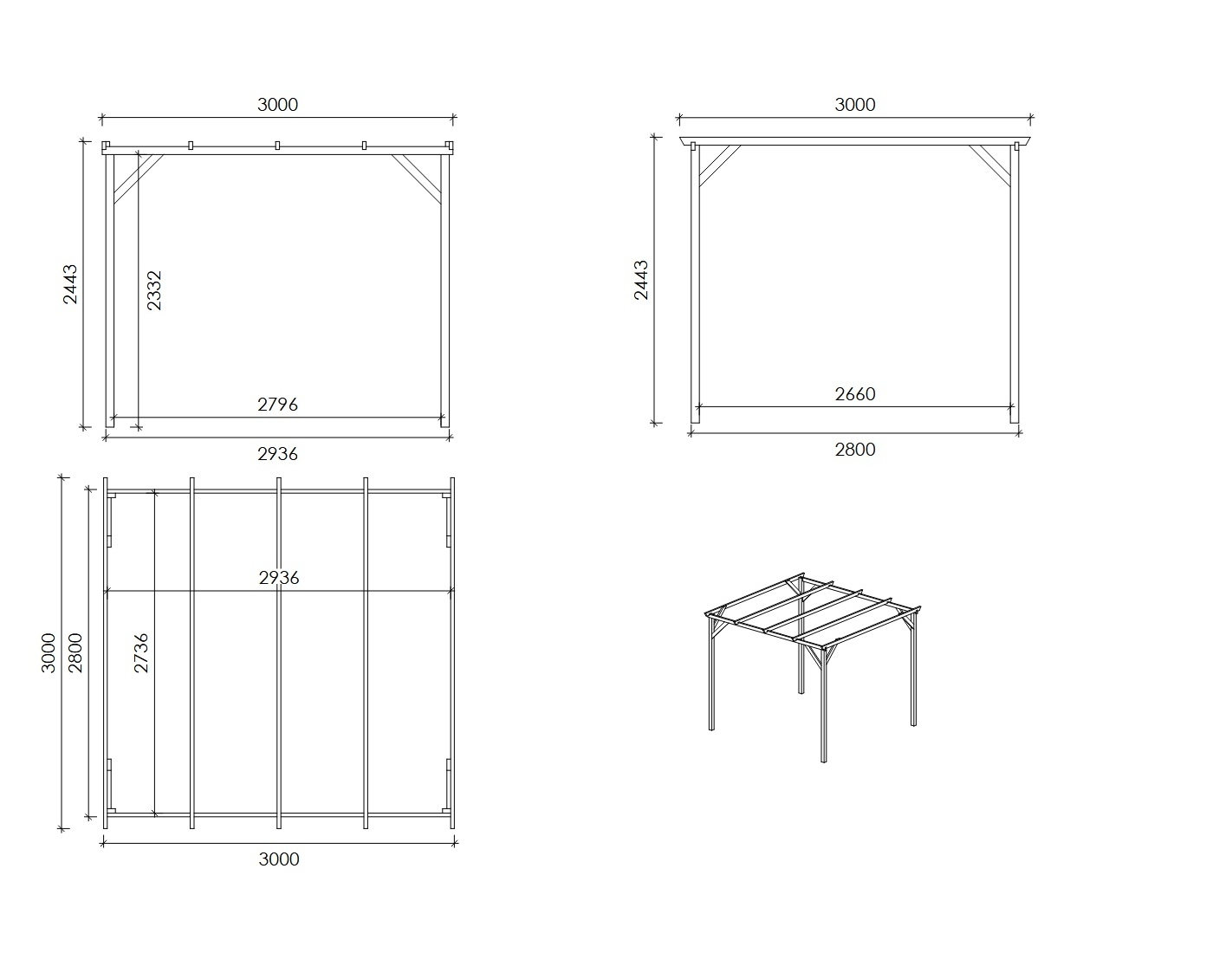 Le carport proposé CAR12, d'une largeur de 3 m et d'une profondeur de 3 m, avec une hauteur d'entrée de m, peut être utilisé comme abri de voiture ou par exemple comme abri de terrasse. L'assemblage du carport avec les instructions incluses ne pose pas de problème.