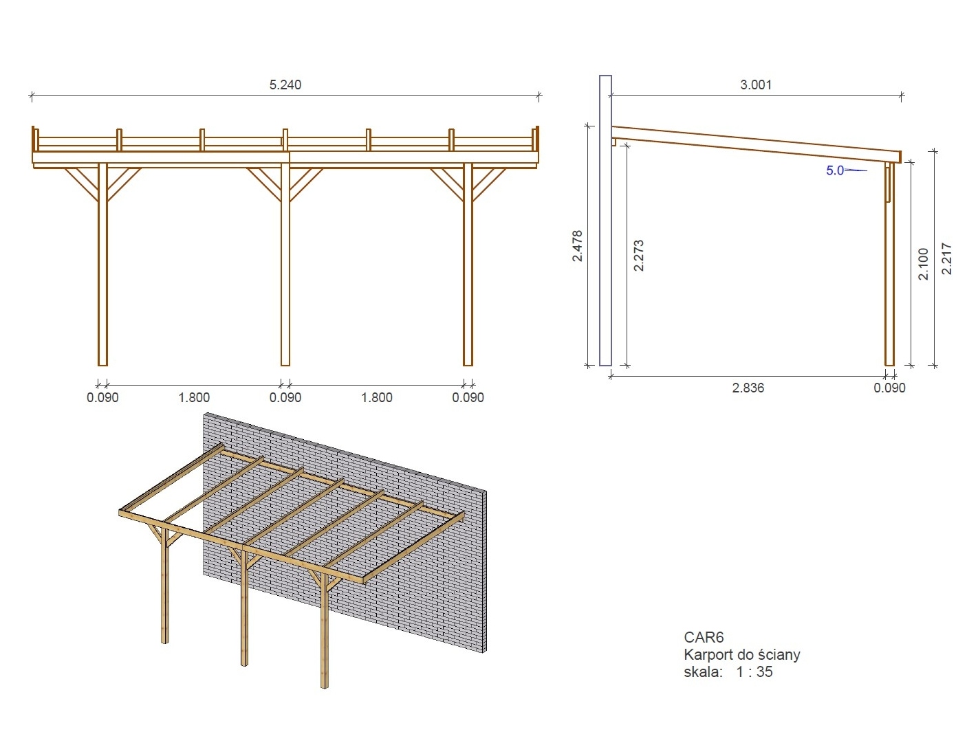 Le carport proposé CAR6, d'une largeur de 3 m et d'une profondeur de 5.24 m, avec une hauteur d'entrée de 2.1 m, peut être utilisé comme abri de voiture ou par exemple comme abri de terrasse. L'assemblage du carport avec les instructions incluses ne pose pas de problème.