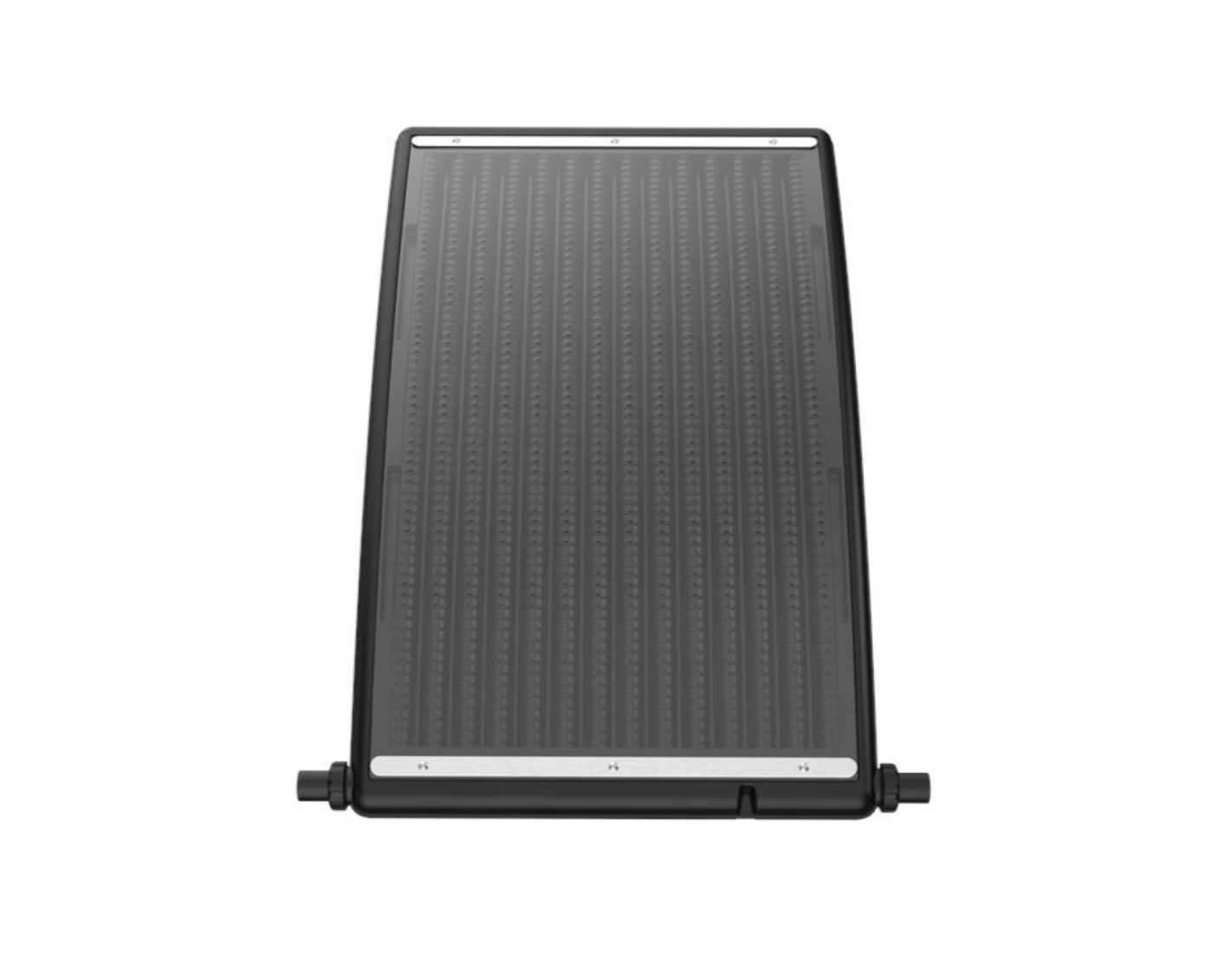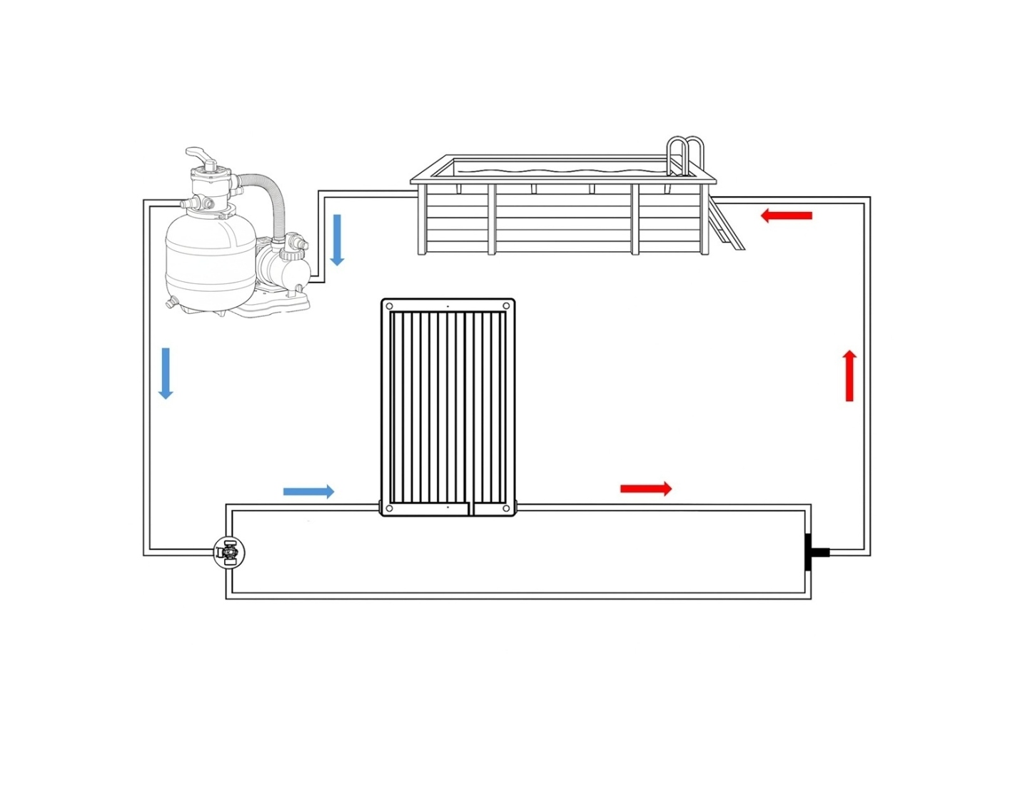 L’eau provenant du système de filtration circule à travers les chambres du panneau, où elle est chauffée par les rayons du soleil, puis retourne dans la piscine. La vanne bypass permet de contrôler le débit : par temps ensoleillé, l’eau est dirigée vers le panneau ; par mauvais temps, elle contourne le système.