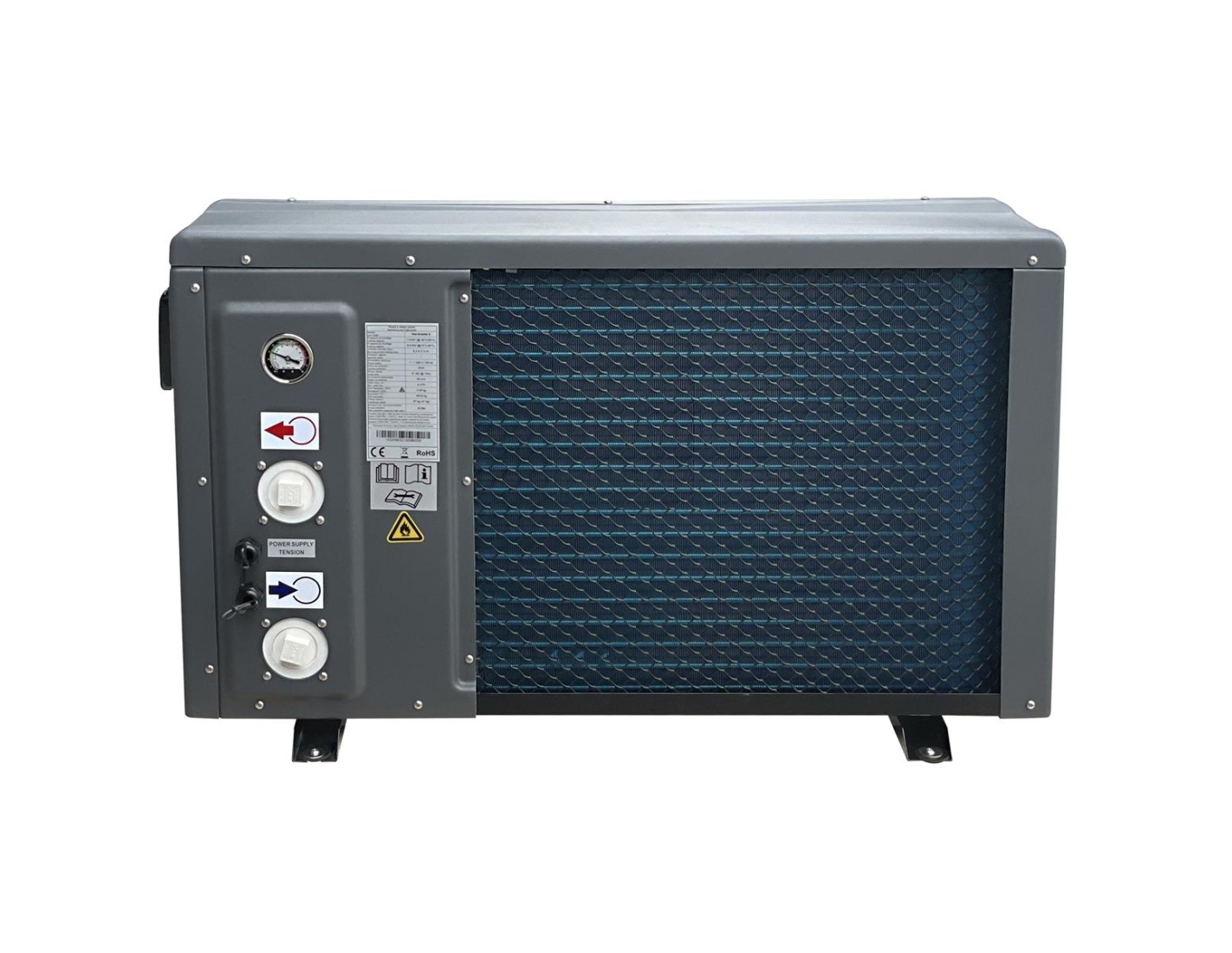 - Équipement inclus : amortisseurs en caoutchouc, raccords d’évacuation du condensat, housse d’hiver, 2 raccords filetés pour tuyau 38 mm