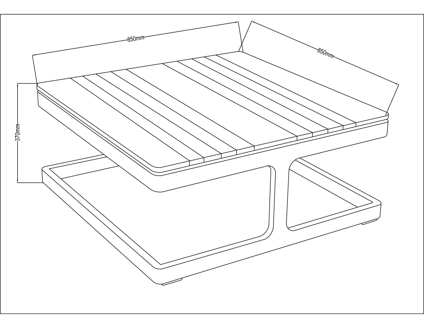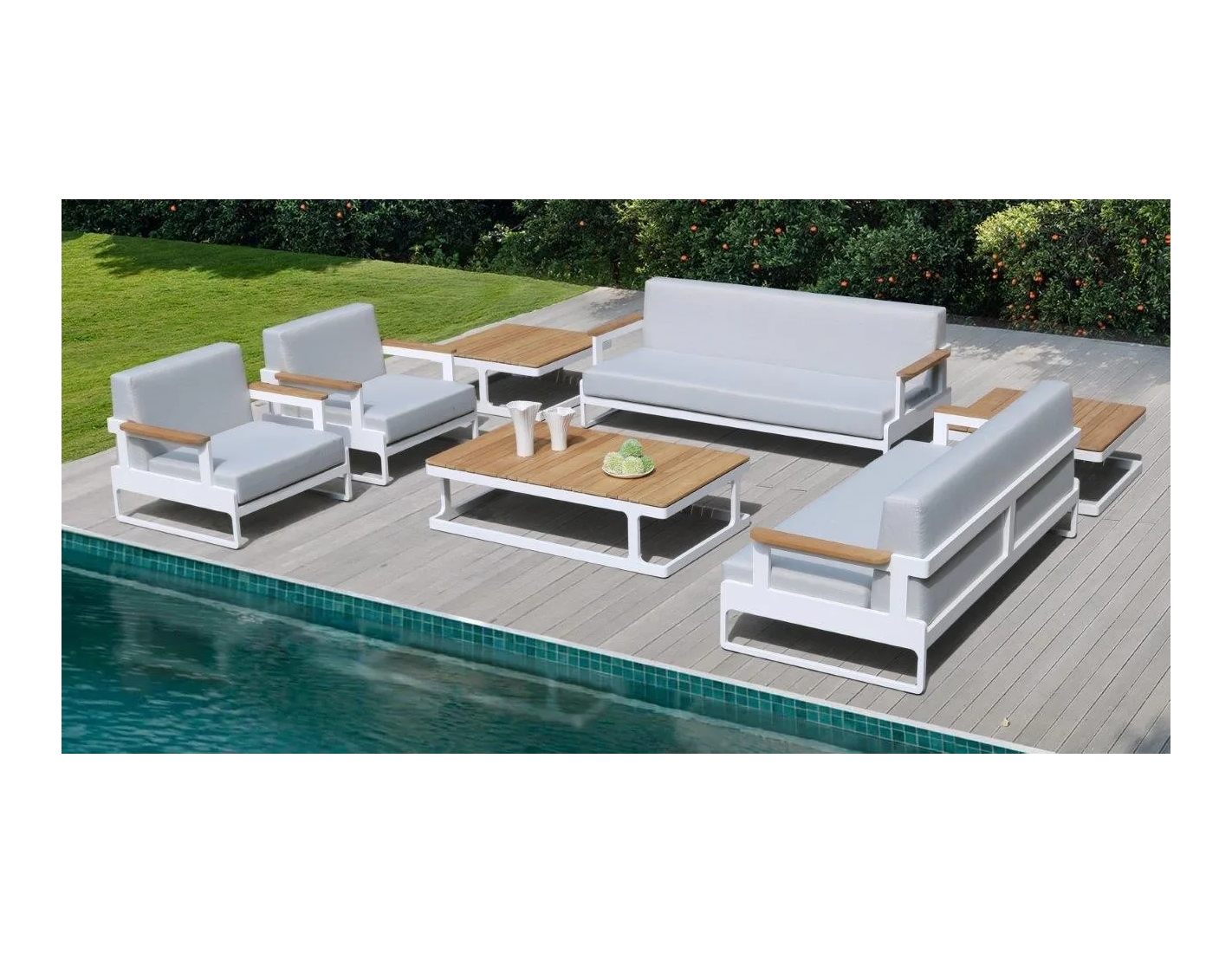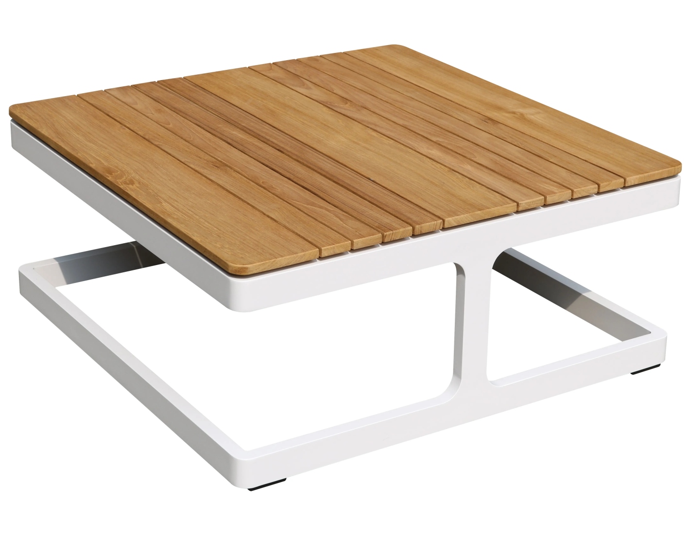 Cadre léger en aluminium peint en poudre de couleur blanche RAL9010. Bois de teck d'une épaisseur de 18 mm.