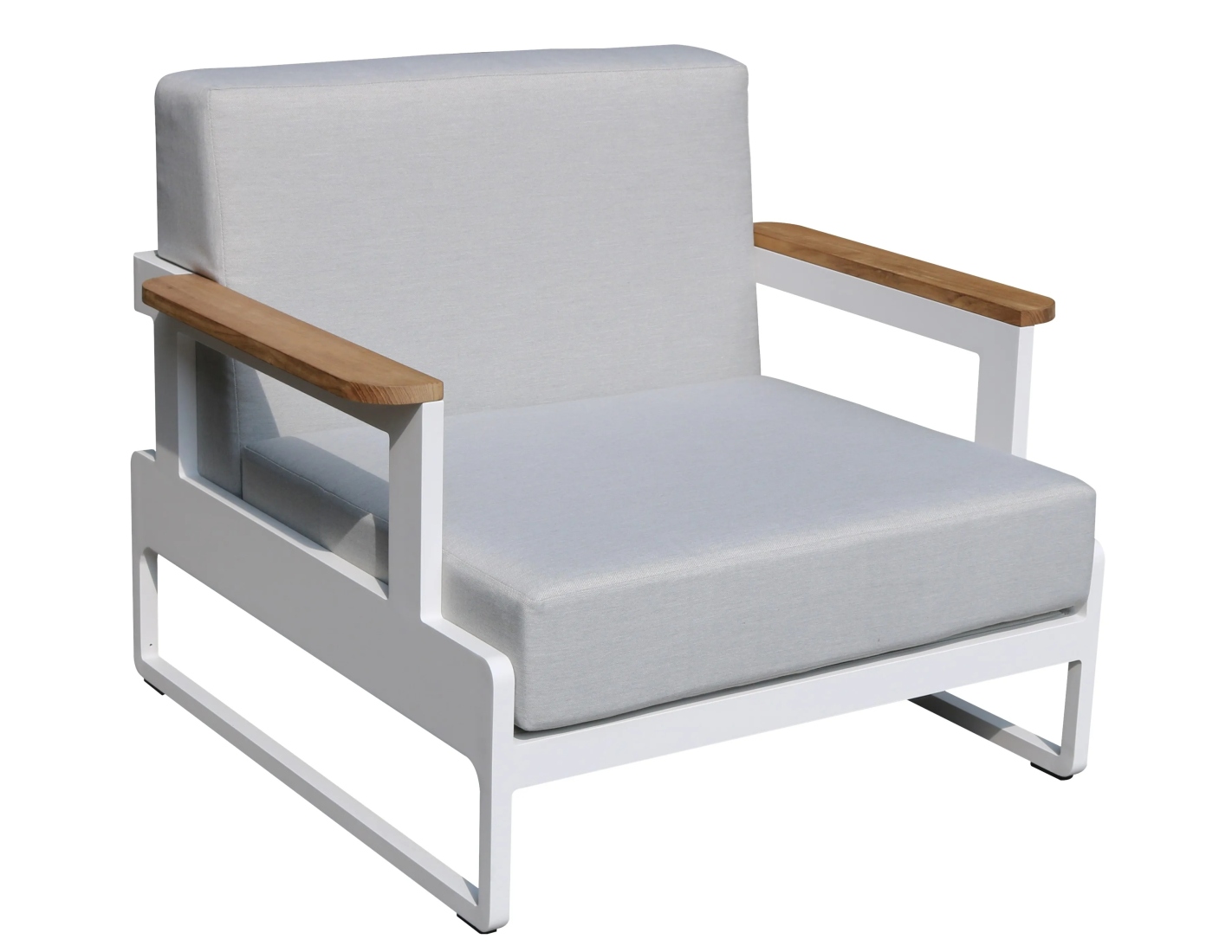 Assise à une hauteur de 36 cm. Structure légère en aluminium peint en poudre de couleur blanche RAL9010. Revêtement en polyester de couleur grise, avec fermeture éclair amovible. Coussins rembourrés de mousse. Vendu ensemble.