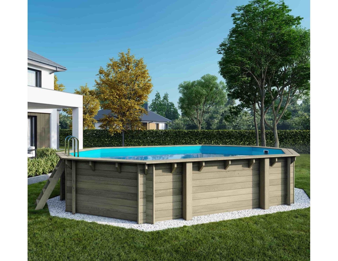 Le bois apporte à l’environnement une touche élégante et chaleureuse, et son aspect classique permet à la piscine de s’intégrer harmonieusement dans tout type de jardin. Vous pouvez ajouter des terrasses en bois, des plantes ou un éclairage décoratif afin de créer une atmosphère véritablement conviviale.