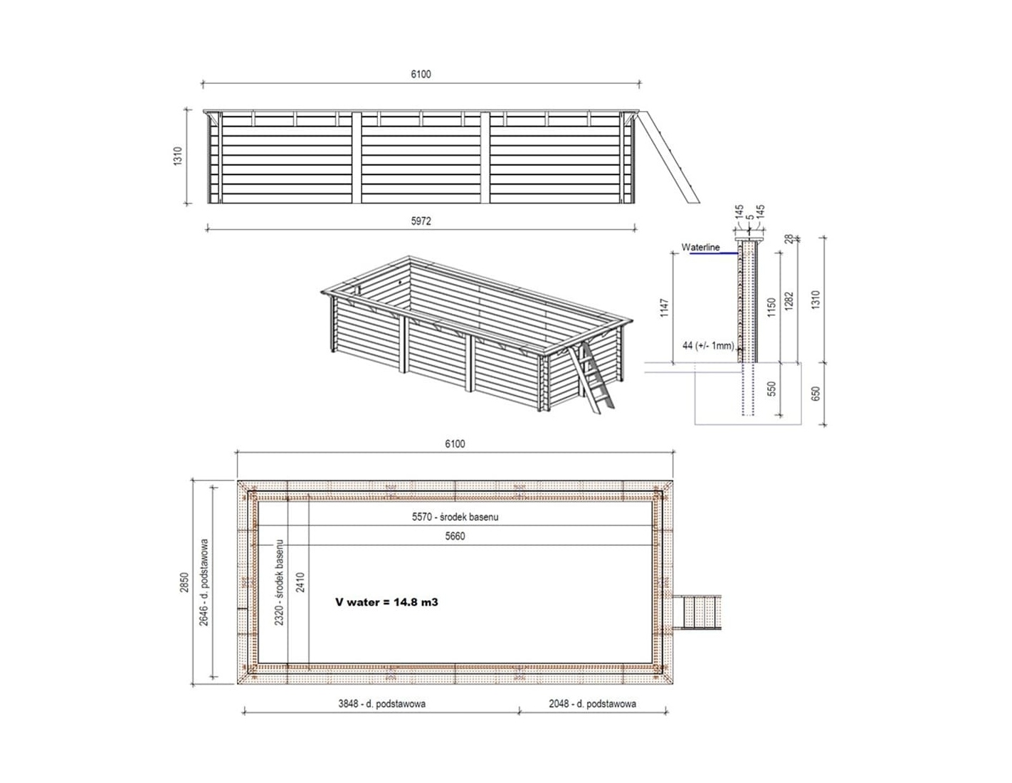 Découvrez notre piscine en bois de dimensions 6.1 m x 2.85 m et d'une hauteur de 1.31 m, fabriquée en bois de pin, imprégnée dans la couleur vert. L'épaisseur des planches est de 44 mm (+/- 1mm), garantissant une construction très solide pour la piscine. L'épaisseur des planches de terrasse est de 28 mm.
