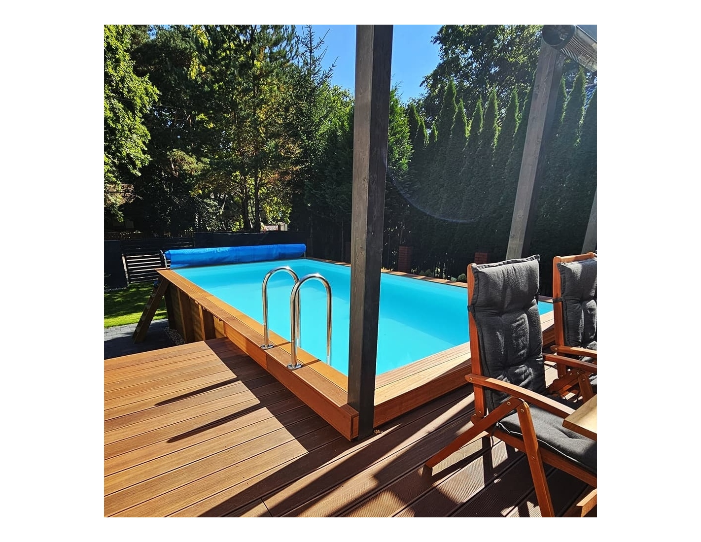 - échelle extérieure en bois, pouvant être retirée lorsque la piscine n'est pas utilisée