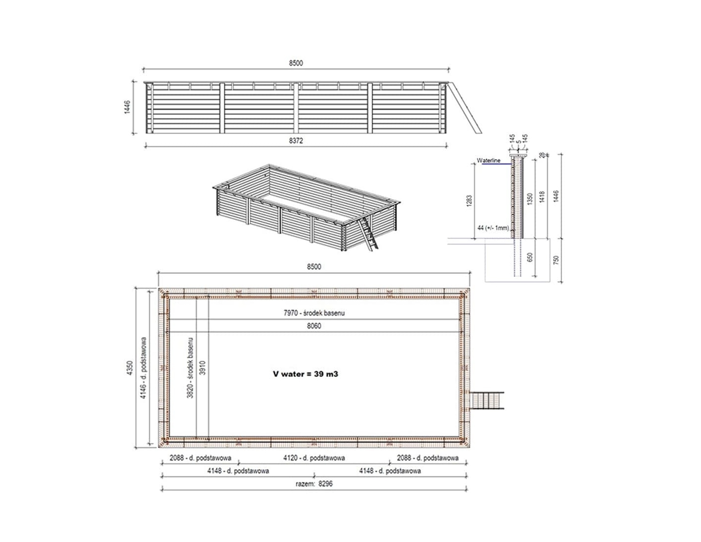 Découvrez notre piscine en bois de dimensions 8.5 m x 4.35 m et d'une hauteur de 1.45 m, fabriquée en bois de pin, imprégnée dans la couleur vert. L'épaisseur des planches est de 44 mm (+/- 1mm), garantissant une construction très solide pour la piscine. L'épaisseur des planches de terrasse est de 28 mm.