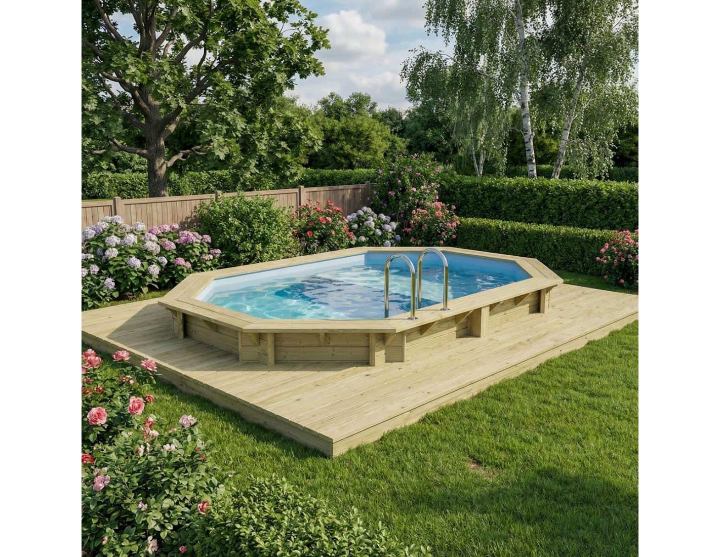 Piscine en bois 6.5 m³ avec zone de détente, idéale pour les enfants et les adultes.