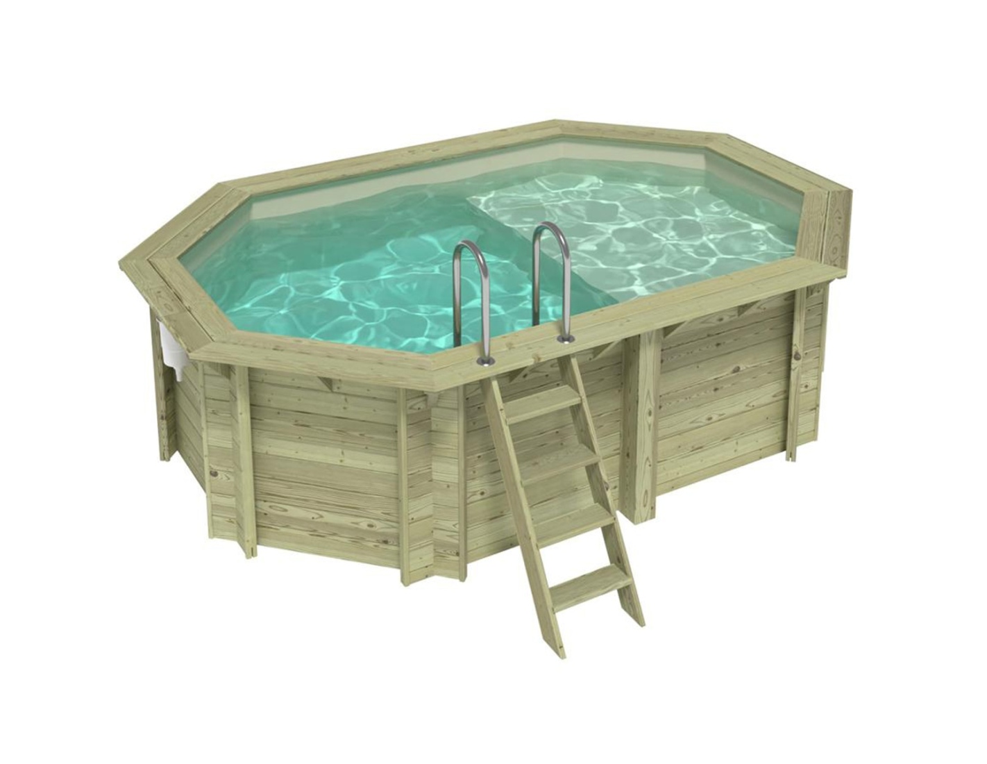 Le modèle de piscine aux dimensions 4.3 × 3 m et d’une hauteur de 1.18 m offre deux niveaux de profondeur – conçu pour ceux qui recherchent plus qu’une piscine en bois classique.