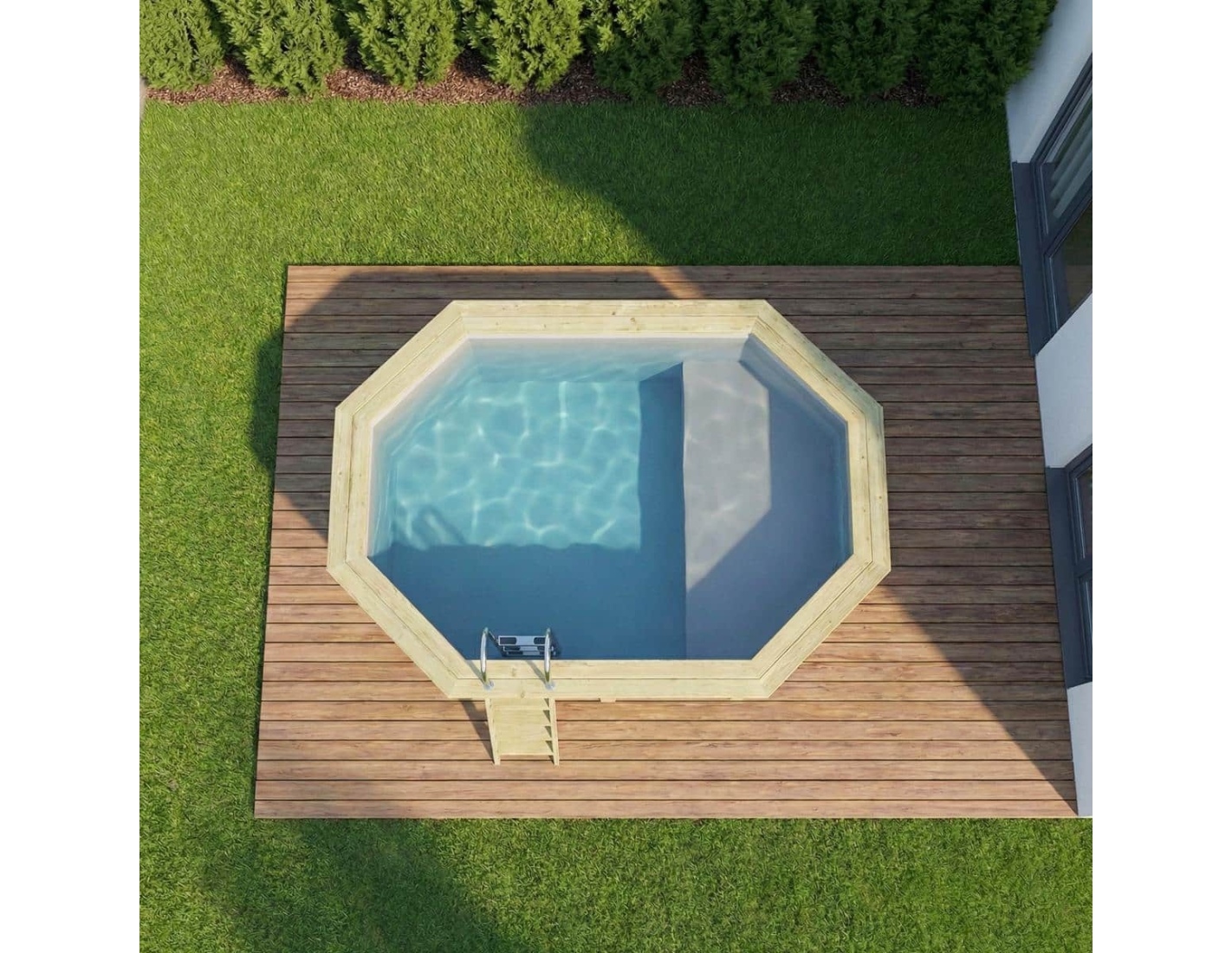 Le modèle de piscine aux dimensions 4.3 × 3 m et d’une hauteur de 1.18 m offre deux niveaux de profondeur – conçu pour ceux qui recherchent plus qu’une piscine en bois classique.