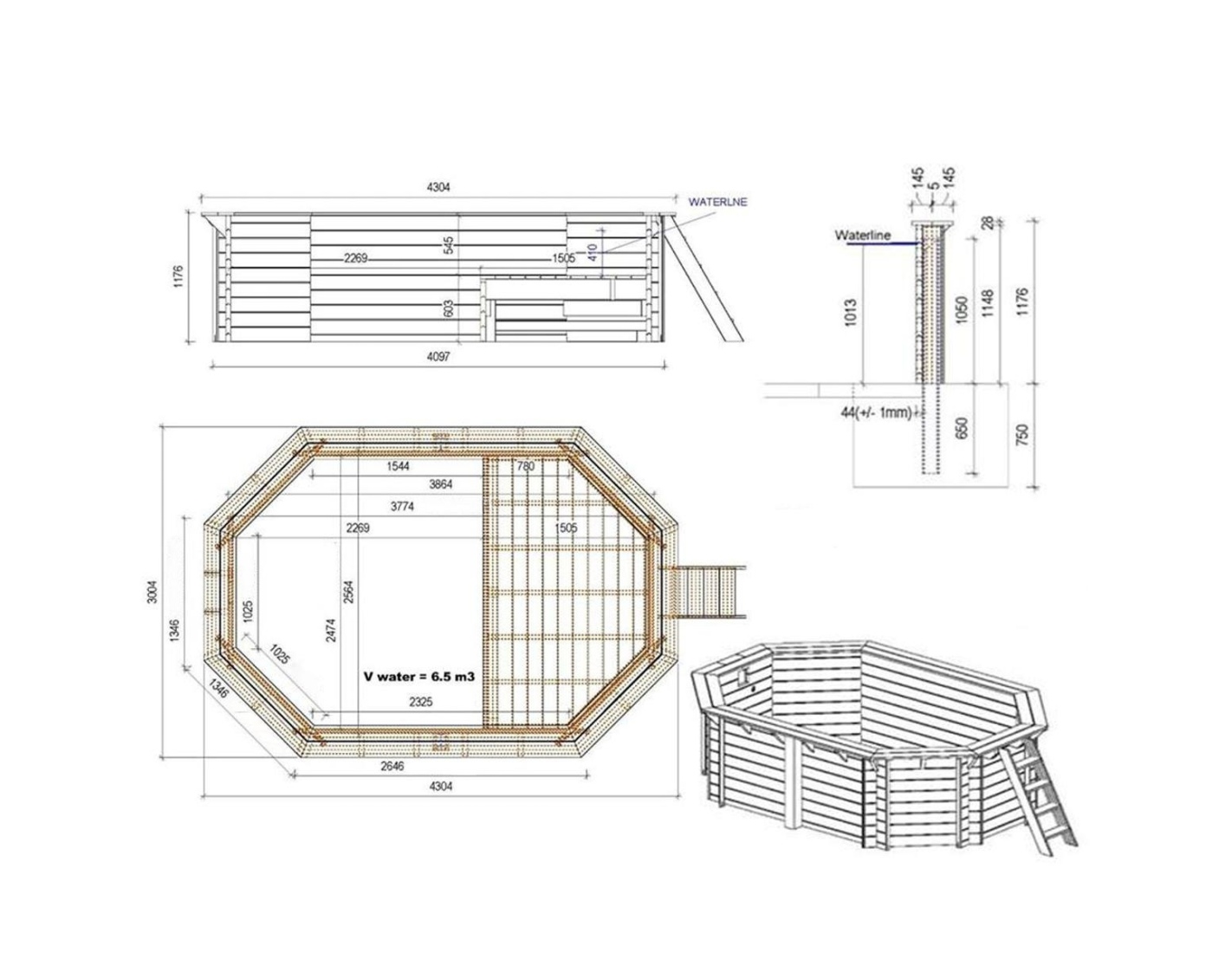 Le modèle de piscine aux dimensions 4.3 × 3 m et d’une hauteur de 1.18 m offre deux niveaux de profondeur – conçu pour ceux qui recherchent plus qu’une piscine en bois classique.
