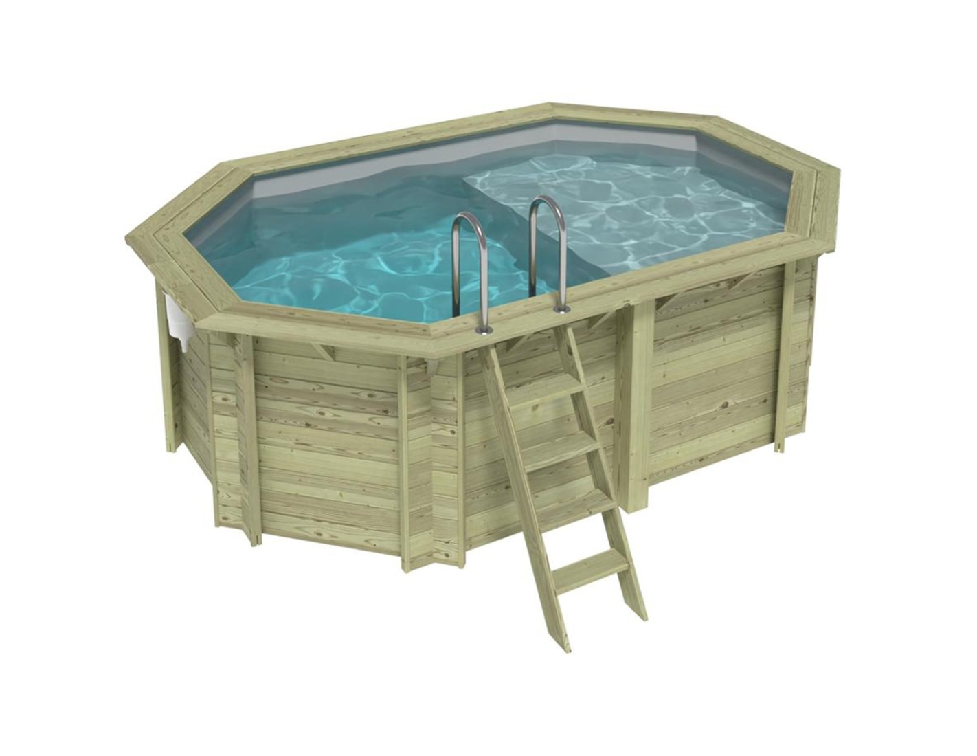 Le modèle de piscine aux dimensions 4.3 × 3 m et d’une hauteur de 1.31 m offre deux niveaux de profondeur – conçu pour ceux qui recherchent plus qu’une piscine en bois classique.