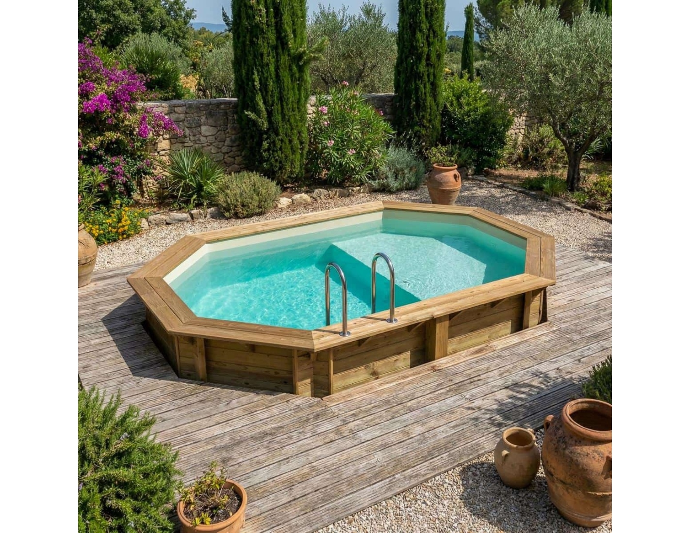 Le bois apporte à l’environnement une touche élégante et chaleureuse, et son aspect classique permet à la piscine de s’intégrer harmonieusement dans tout type de jardin. Vous pouvez ajouter des terrasses en bois, des plantes ou un éclairage décoratif afin de créer une atmosphère véritablement conviviale.