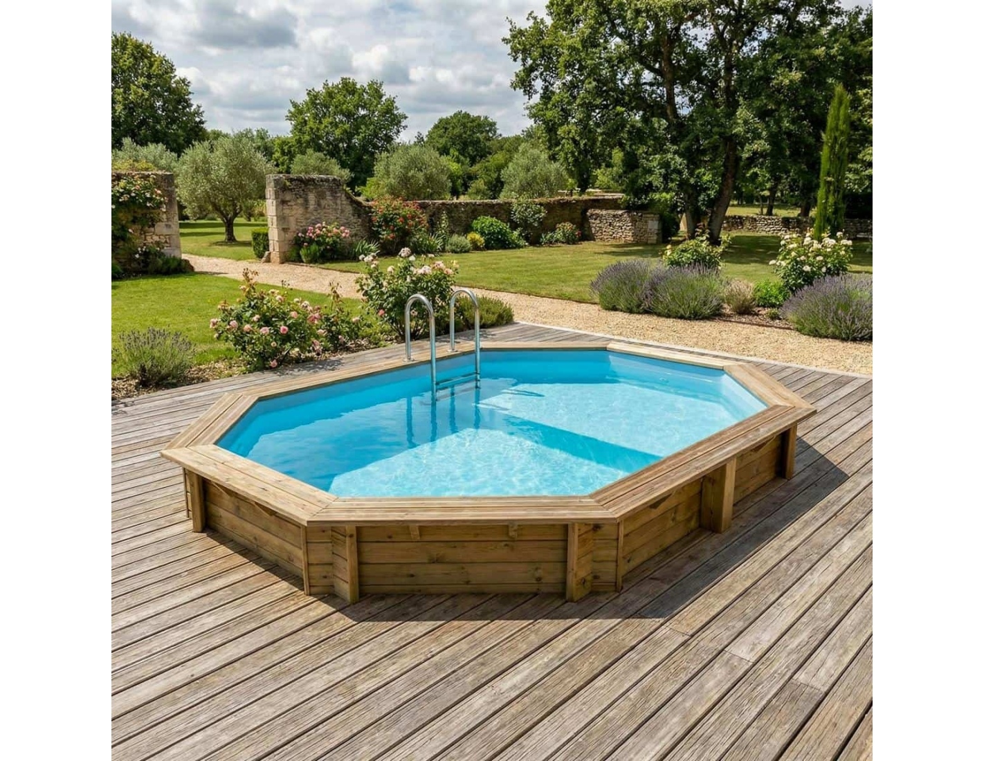 Le bois apporte à l’environnement une touche élégante et chaleureuse, et son aspect classique permet à la piscine de s’intégrer harmonieusement dans tout type de jardin. Vous pouvez ajouter des terrasses en bois, des plantes ou un éclairage décoratif afin de créer une atmosphère véritablement conviviale.