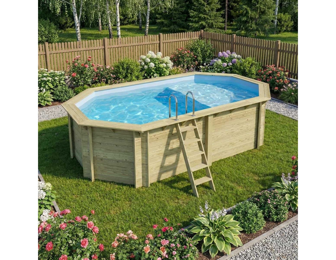 Le modèle de piscine aux dimensions 5.79 × 3.49 m et d’une hauteur de 1.45 m offre deux niveaux de profondeur – conçu pour ceux qui recherchent plus qu’une piscine en bois classique.