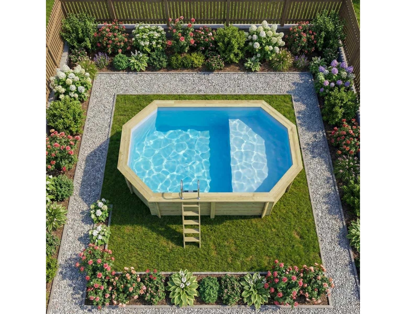 Le modèle de piscine aux dimensions 5.79 × 3.49 m et d’une hauteur de 1.45 m offre deux niveaux de profondeur – conçu pour ceux qui recherchent plus qu’une piscine en bois classique.