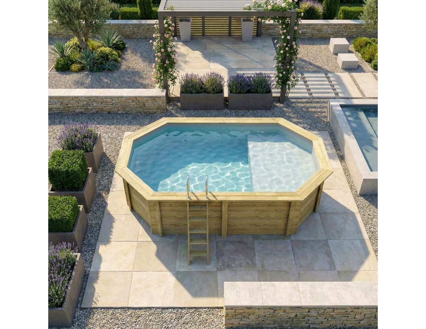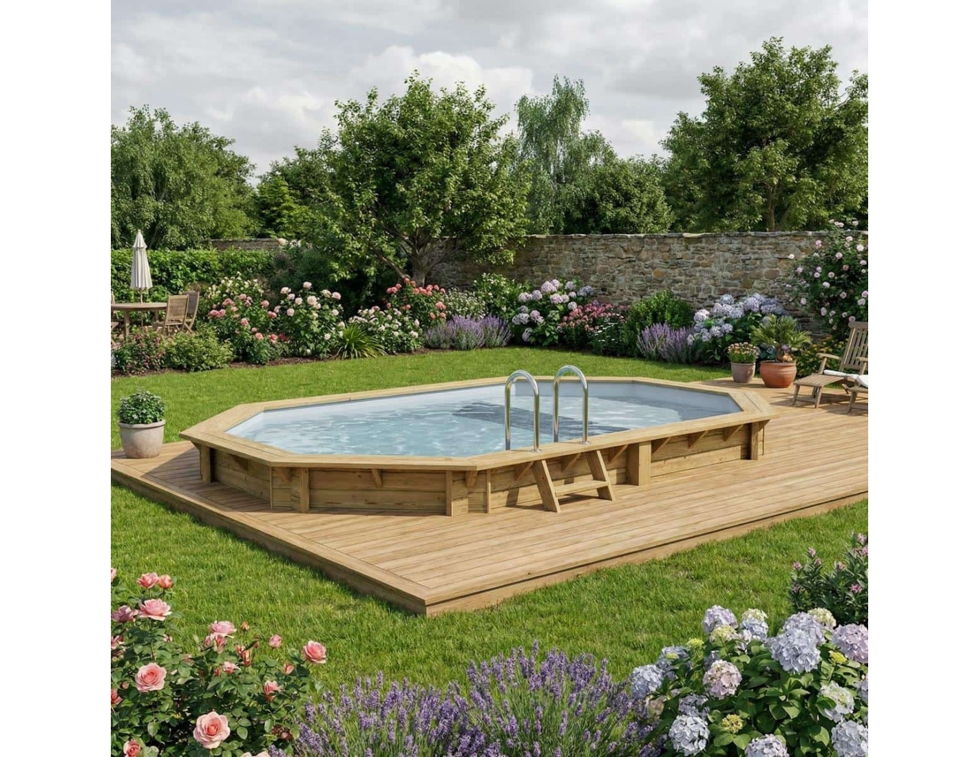 Le bois apporte à l’environnement une touche élégante et chaleureuse, et son aspect classique permet à la piscine de s’intégrer harmonieusement dans tout type de jardin. Vous pouvez ajouter des terrasses en bois, des plantes ou un éclairage décoratif afin de créer une atmosphère véritablement conviviale.