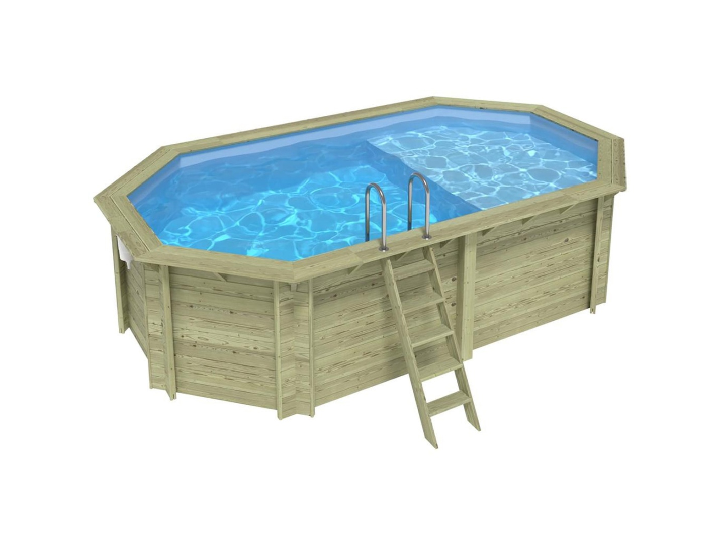 Le modèle de piscine aux dimensions 5.79 × 3.49 m et d’une hauteur de 1.45 m offre deux niveaux de profondeur – conçu pour ceux qui recherchent plus qu’une piscine en bois classique.