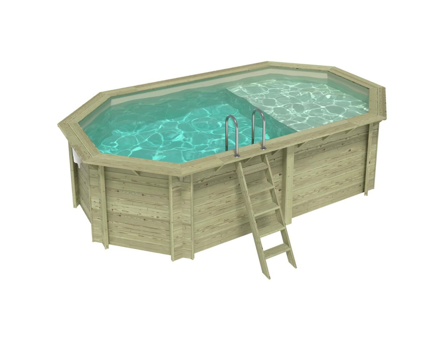 Le modèle de piscine aux dimensions 5.79 × 3.49 m et d’une hauteur de 1.45 m offre deux niveaux de profondeur – conçu pour ceux qui recherchent plus qu’une piscine en bois classique.