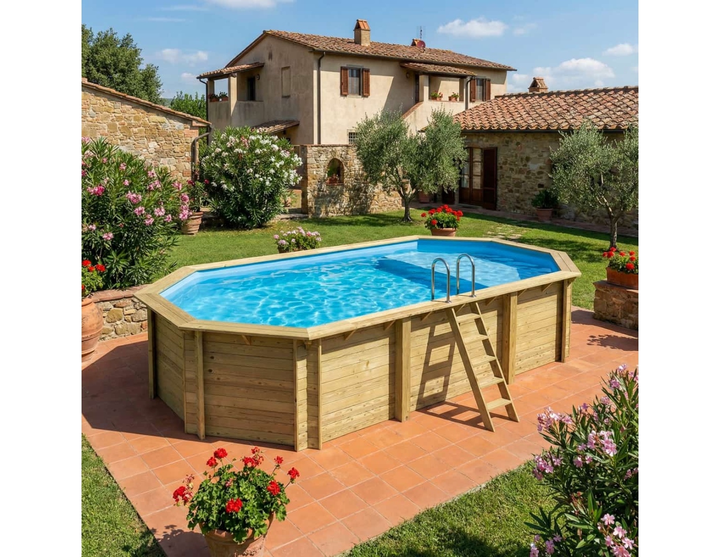 La piscine est fabriquée en bois de pin imprégné qui, en plus de son esthétique, grâce au processus d’imprégnation :