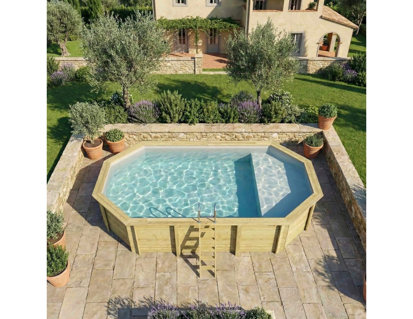 Le modèle de piscine aux dimensions 7.3 × 3.97 m et d’une hauteur de 1.45 m offre deux niveaux de profondeur – conçu pour ceux qui recherchent plus qu’une piscine en bois classique.