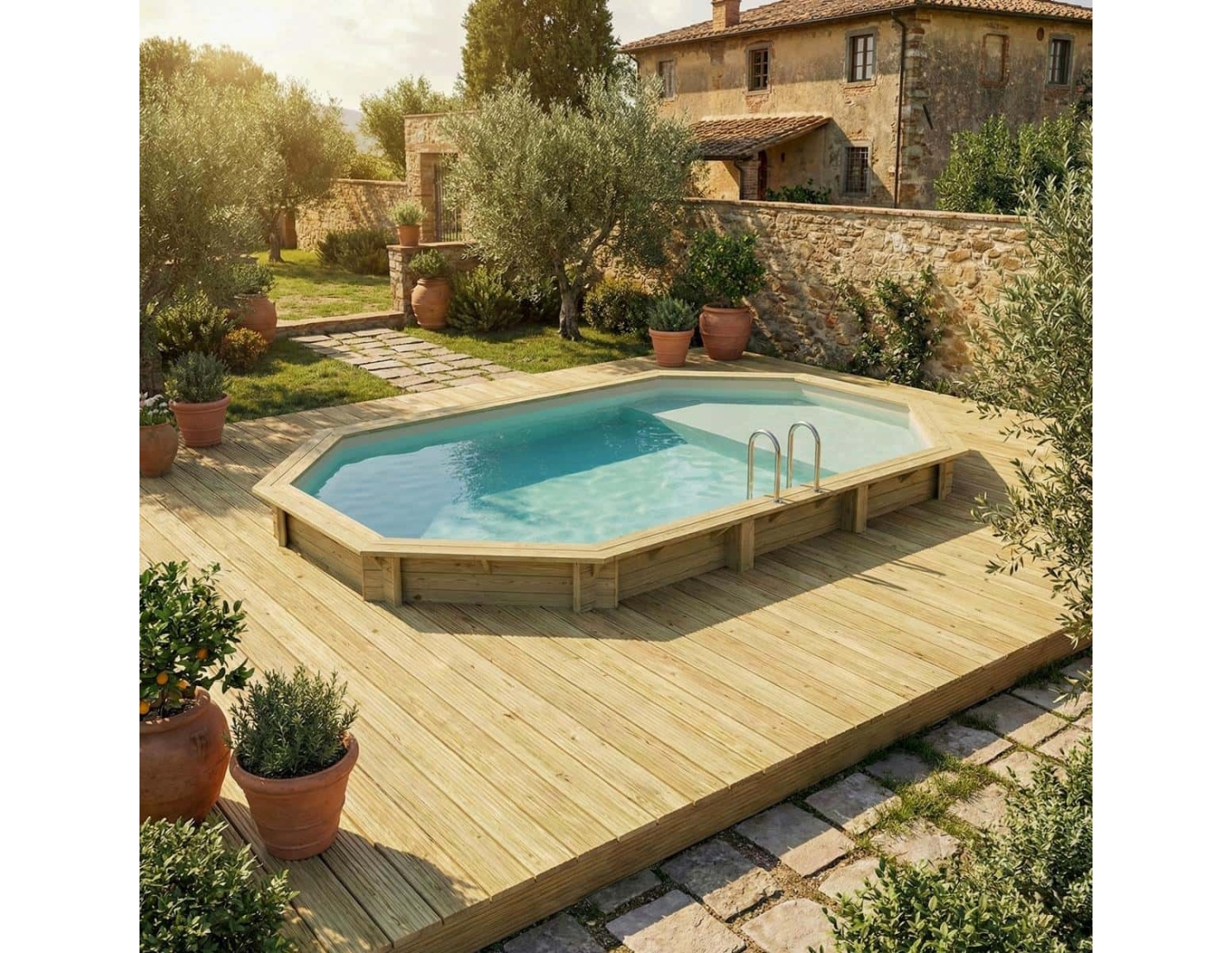Piscine en bois 22.5 m³ avec zone de détente, idéale pour les enfants et les adultes.