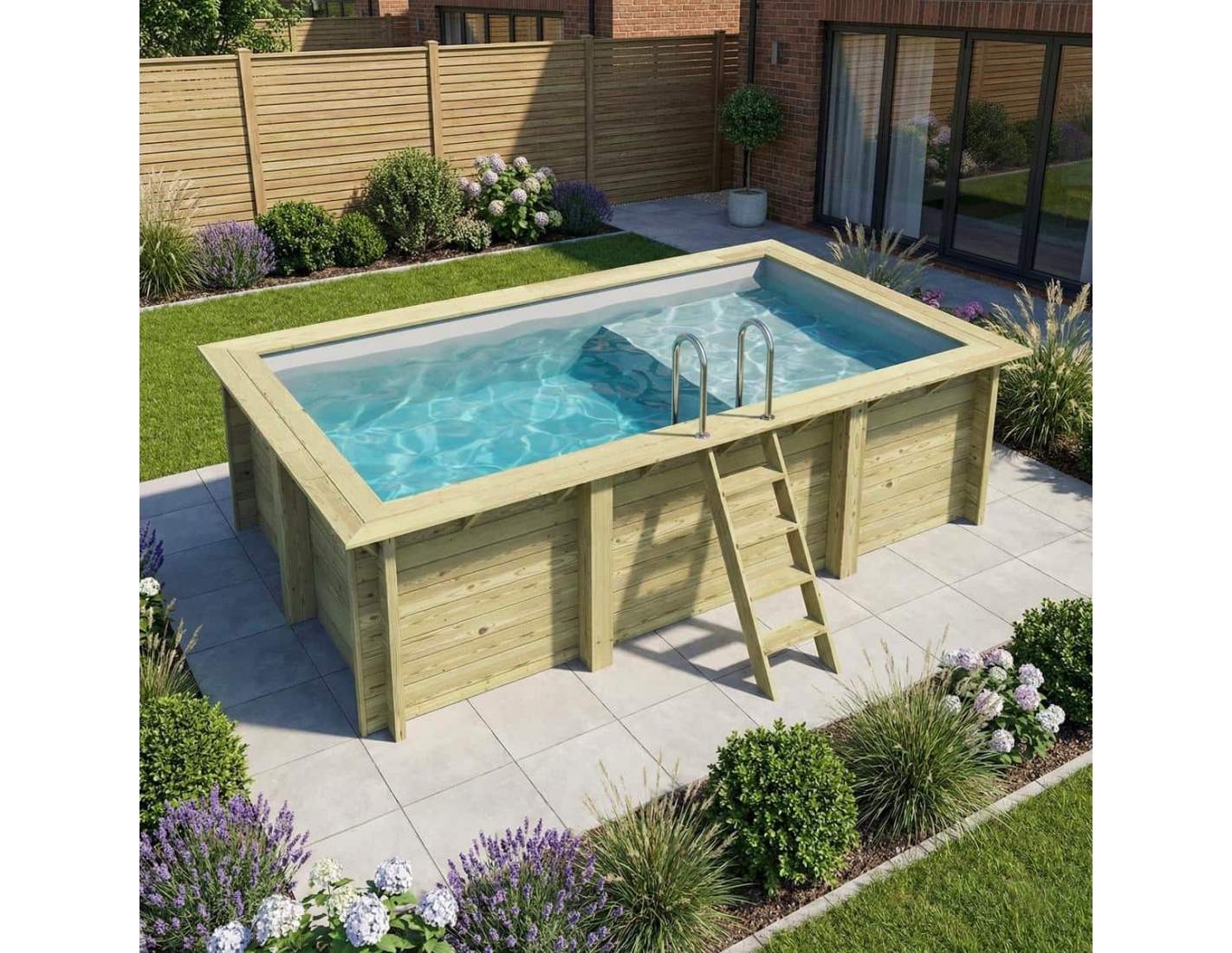 Le modèle de piscine aux dimensions 4.65 × 2.85 m et d’une hauteur de 1.24 m offre deux niveaux de profondeur – conçu pour ceux qui recherchent plus qu’une piscine en bois classique.