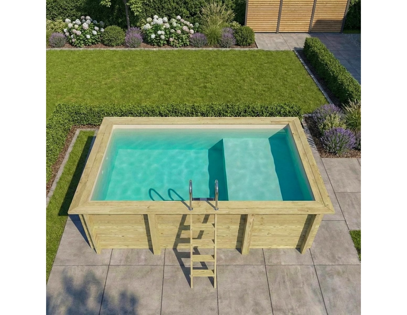 Le modèle de piscine aux dimensions 4.65 × 2.85 m et d’une hauteur de 1.24 m offre deux niveaux de profondeur – conçu pour ceux qui recherchent plus qu’une piscine en bois classique.