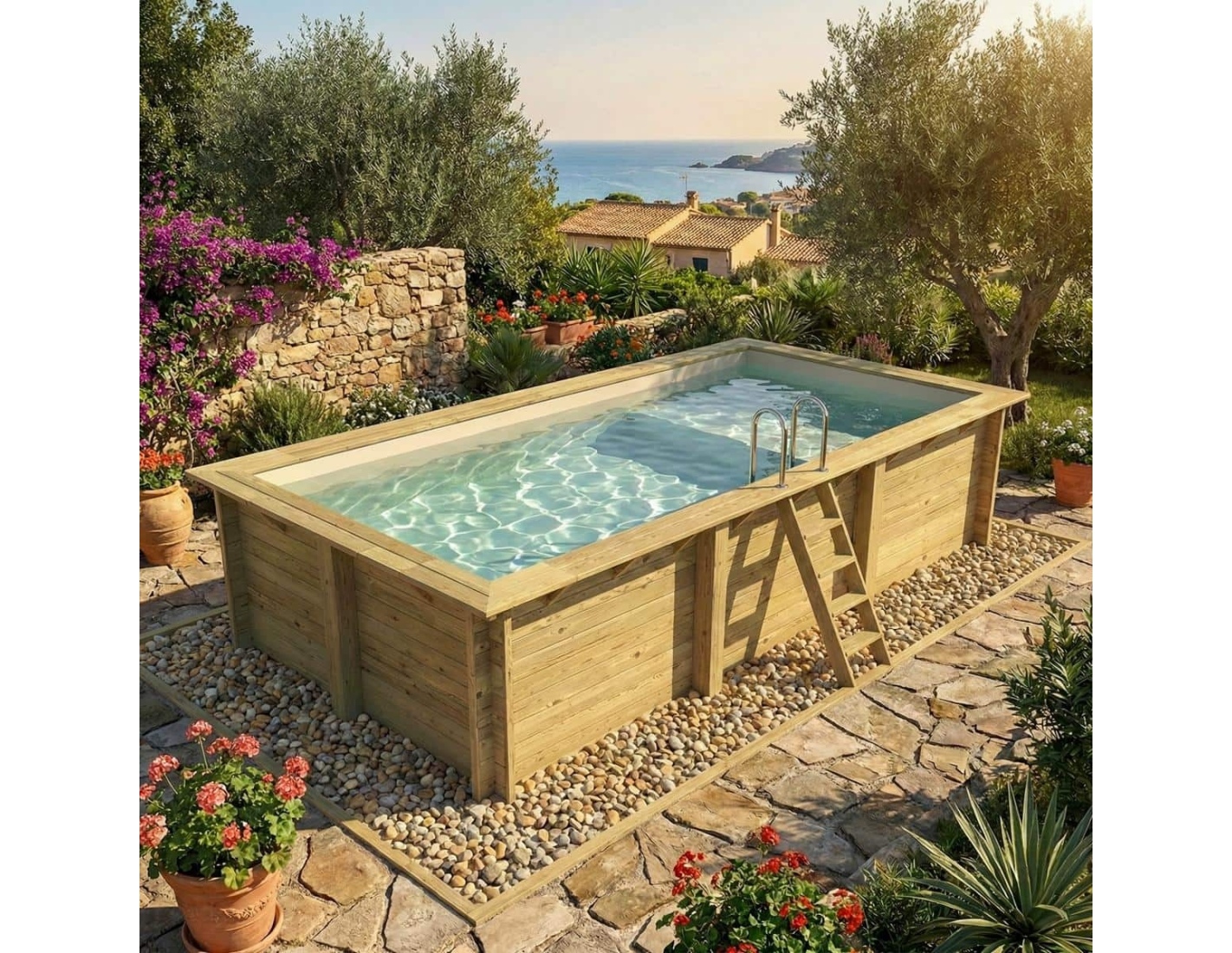 La piscine est fabriquée en bois de pin imprégné qui, en plus de son esthétique, grâce au processus d’imprégnation :