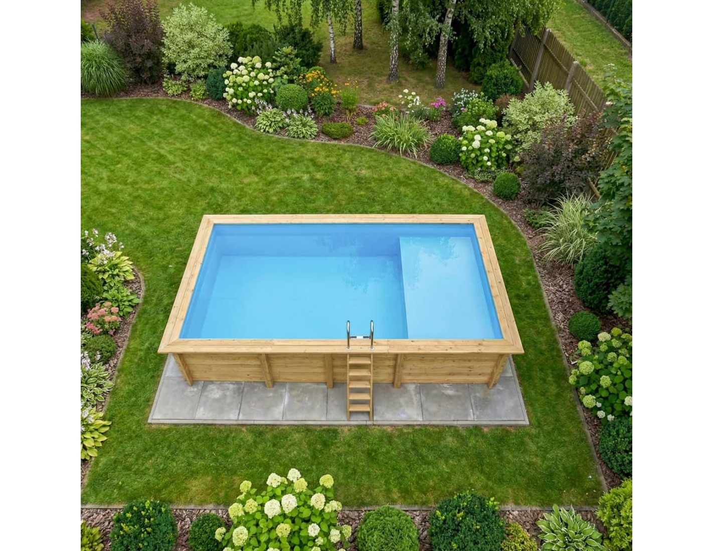 Le modèle de piscine aux dimensions 7 × 3.75 m et d’une hauteur de 1.45 m offre deux niveaux de profondeur – conçu pour ceux qui recherchent plus qu’une piscine en bois classique.
