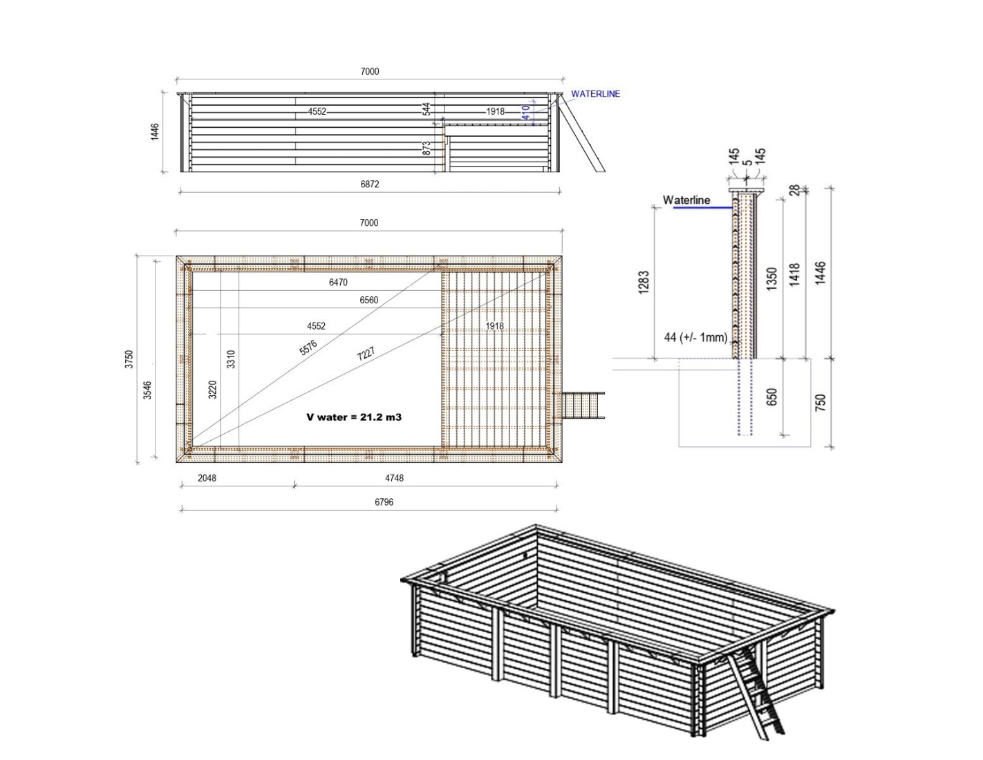 Le modèle de piscine aux dimensions 7 × 3.75 m et d’une hauteur de 1.45 m offre deux niveaux de profondeur – conçu pour ceux qui recherchent plus qu’une piscine en bois classique.
