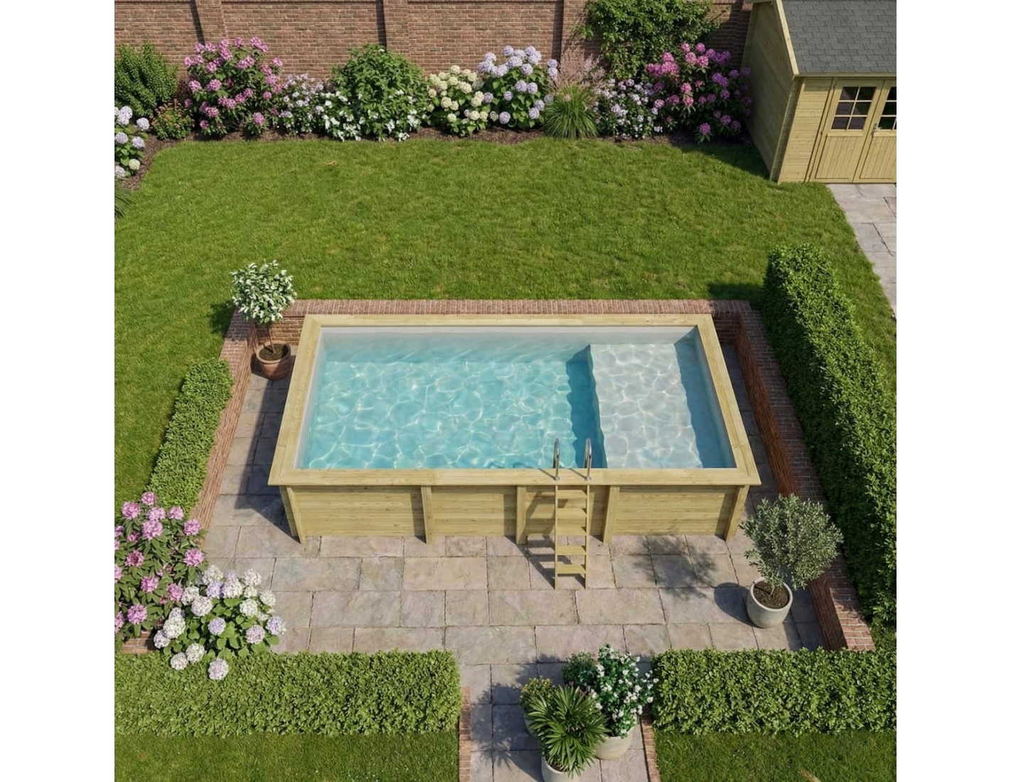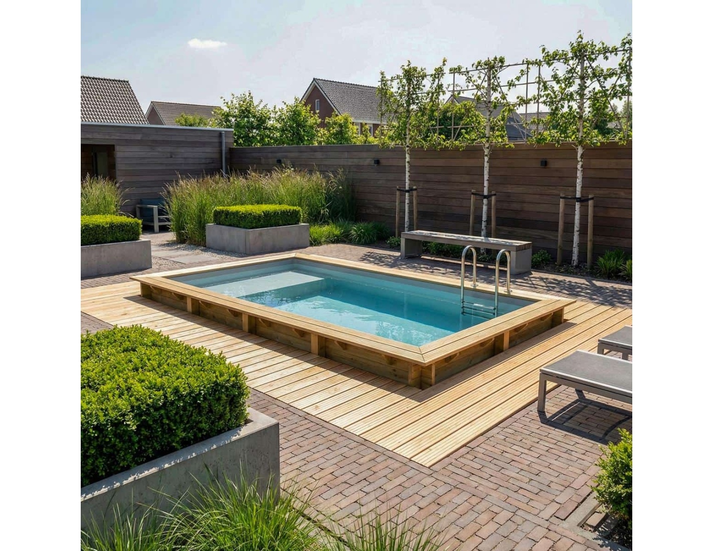 Découvrez une piscine qui associe la beauté naturelle du bois, la stabilité de la structure et une solution unique de zone de détente peu profonde.