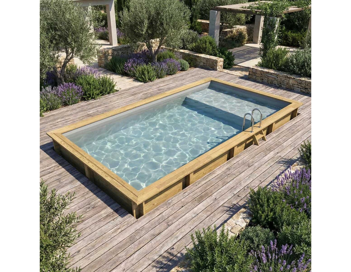 Découvrez une piscine qui associe la beauté naturelle du bois, la stabilité de la structure et une solution unique de zone de détente peu profonde.