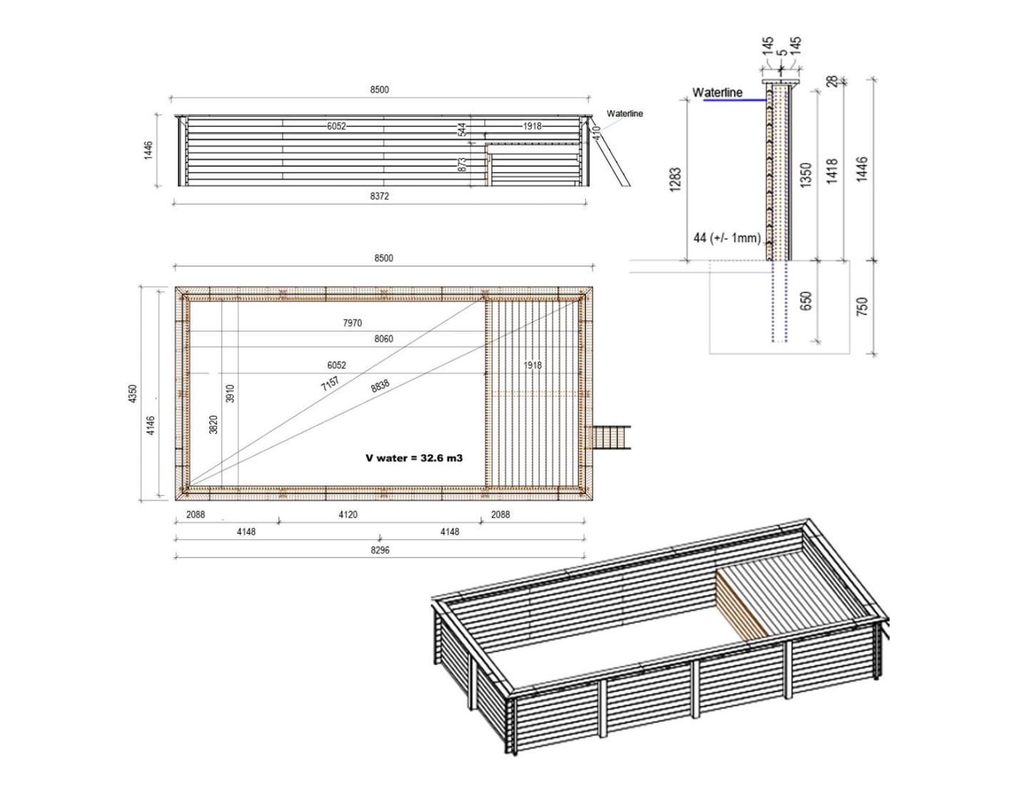 Le modèle de piscine aux dimensions 8.5 × 4.35 m et d’une hauteur de 1.45 m offre deux niveaux de profondeur – conçu pour ceux qui recherchent plus qu’une piscine en bois classique.