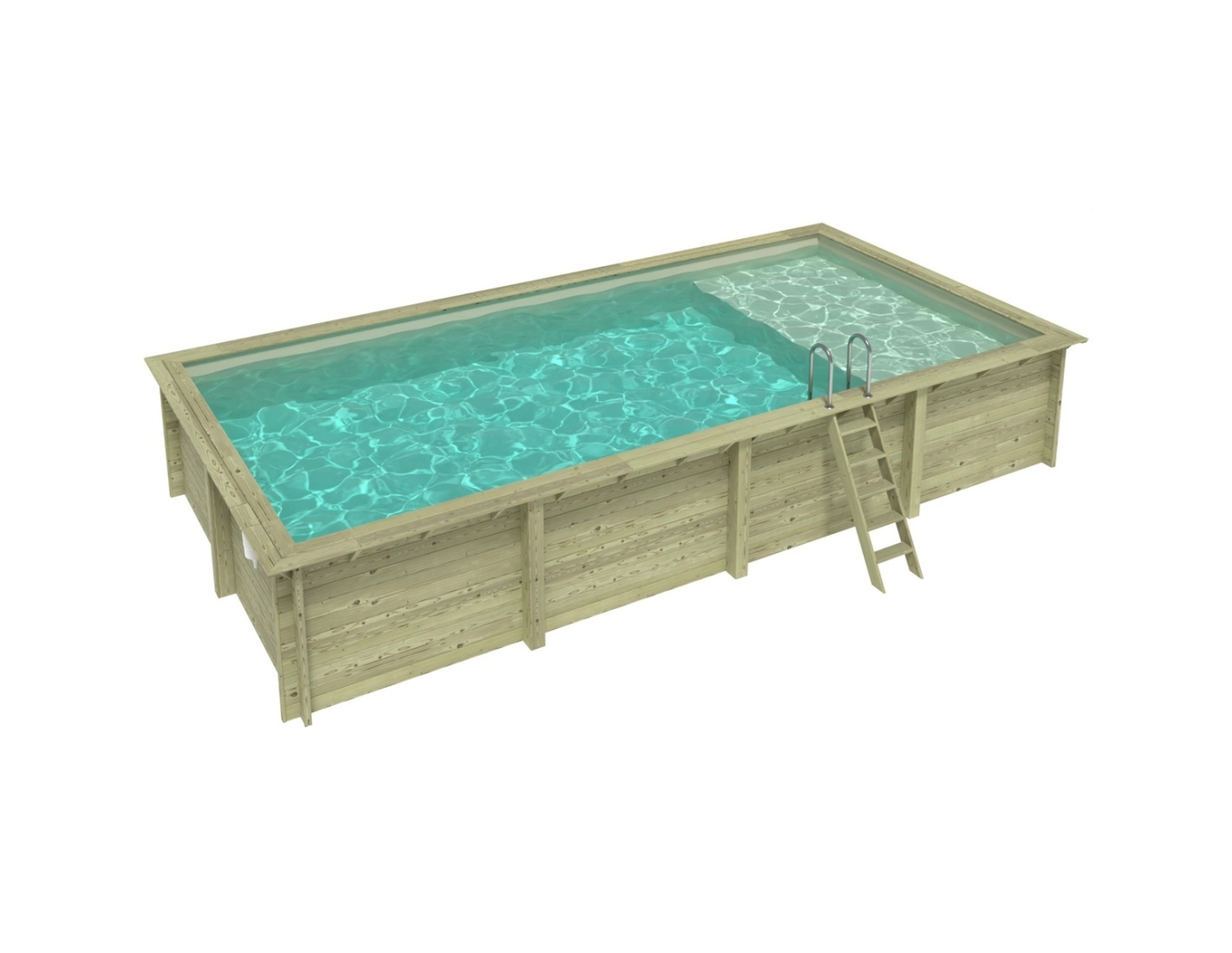 Le modèle de piscine aux dimensions 8.5 × 4.35 m et d’une hauteur de 1.45 m offre deux niveaux de profondeur – conçu pour ceux qui recherchent plus qu’une piscine en bois classique.