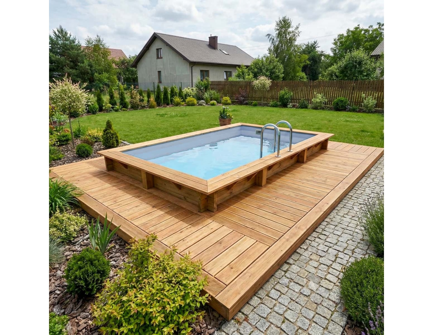 Lors des journées chaudes, la piscine dans le jardin devient votre refuge contre la chaleur – un centre naturel de la vie estivale, où vous pouvez vous détendre, reprendre des forces ou partager des moments avec votre famille et vos amis.