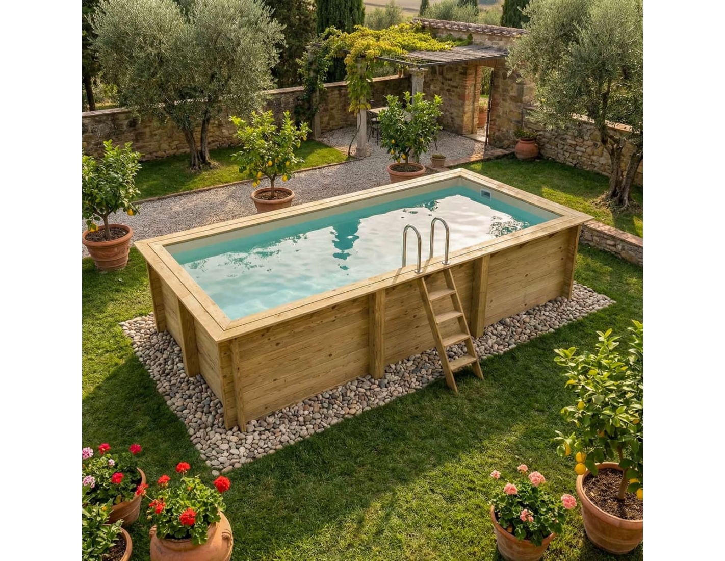 Le bois apporte à l’environnement une touche élégante et chaleureuse, et son aspect classique permet à la piscine de s’intégrer harmonieusement dans tout type de jardin. Vous pouvez ajouter des terrasses en bois, des plantes ou un éclairage décoratif afin de créer une atmosphère véritablement conviviale.