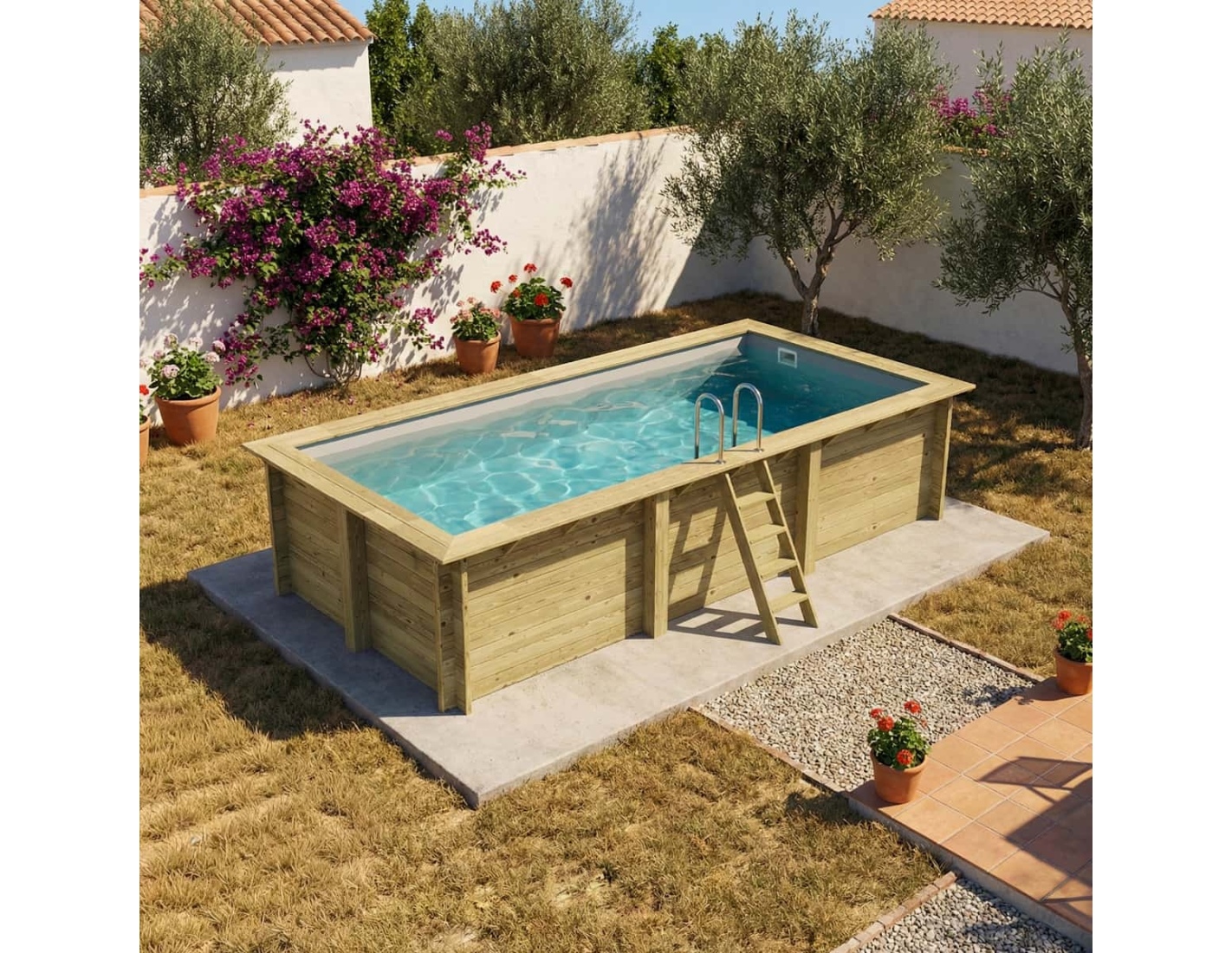 La piscine est fabriquée en bois de pin imprégné qui, en plus de son esthétique, grâce au processus d’imprégnation :