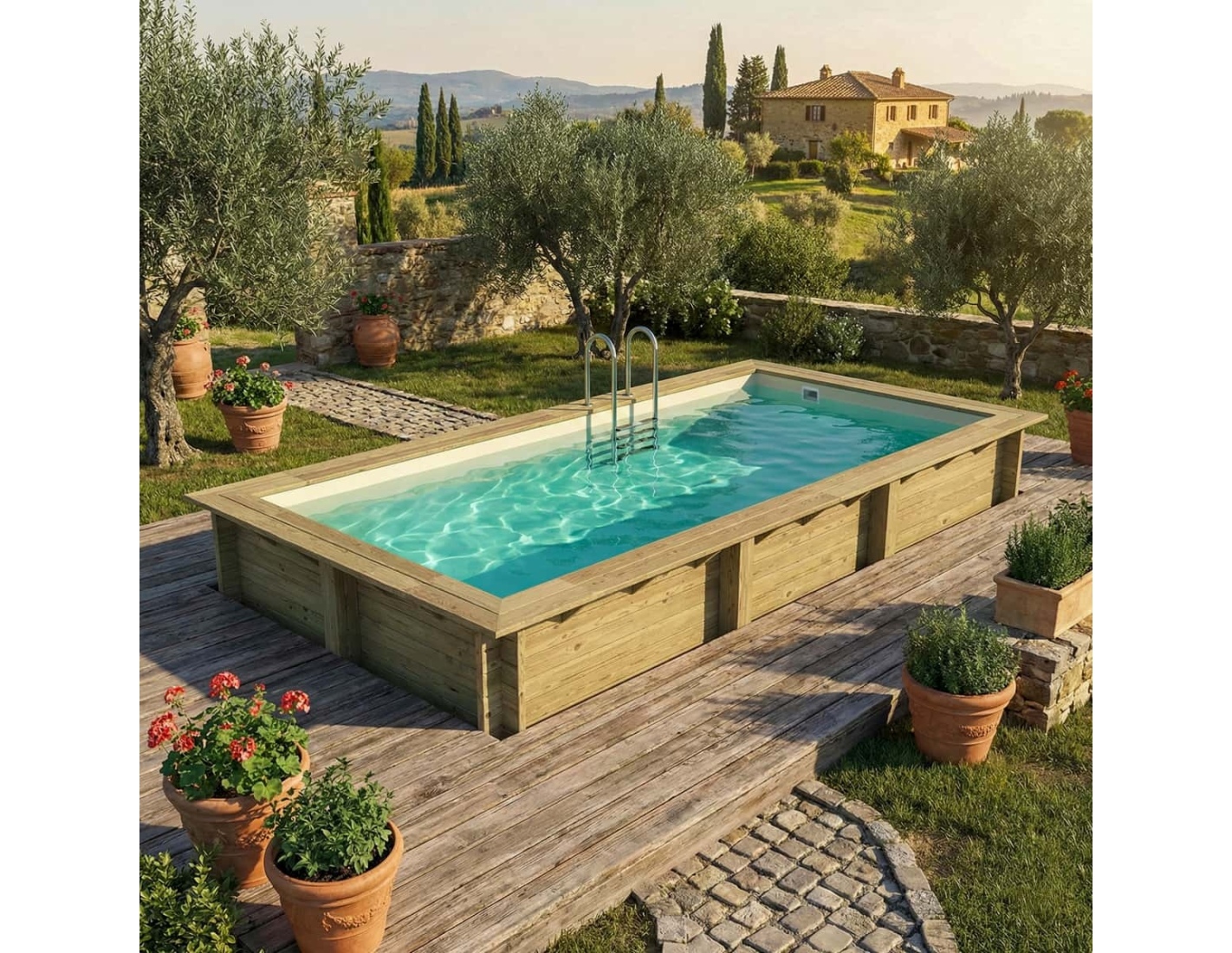 Lors des journées chaudes, la piscine dans le jardin devient votre refuge contre la chaleur – un centre naturel de la vie estivale, où vous pouvez vous détendre, reprendre des forces ou partager des moments avec votre famille et vos amis.