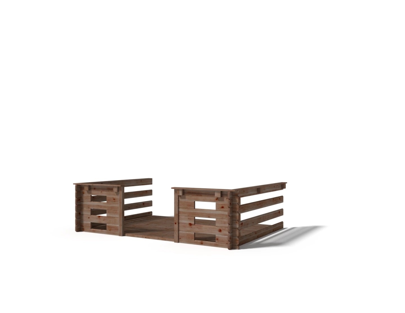 Terrasse en bois avec balustrade DOM147 d'une superficie de 6 m2, d'une largeur de 3 m et d'une profondeur de 2 m. La terrase s'adapte aux abris en bois d'une largeur de 3 m en façade et d'une épaisseur de 28 mm, proposés par ALTANKA p.s.a. Le montage avec les instructions incluses ne pose pas de problèmes.