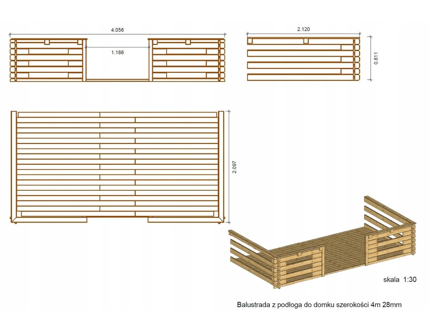 Terrasse en bois avec balustrade DOM18 d'une superficie de 8 m2, d'une largeur de 4 m et d'une profondeur de 2 m. La terrase s'adapte aux abris en bois d'une largeur de 4 m en façade et d'une épaisseur de 28 mm, proposés par ALTANKA p.s.a. Le montage avec les instructions incluses ne pose pas de problèmes.