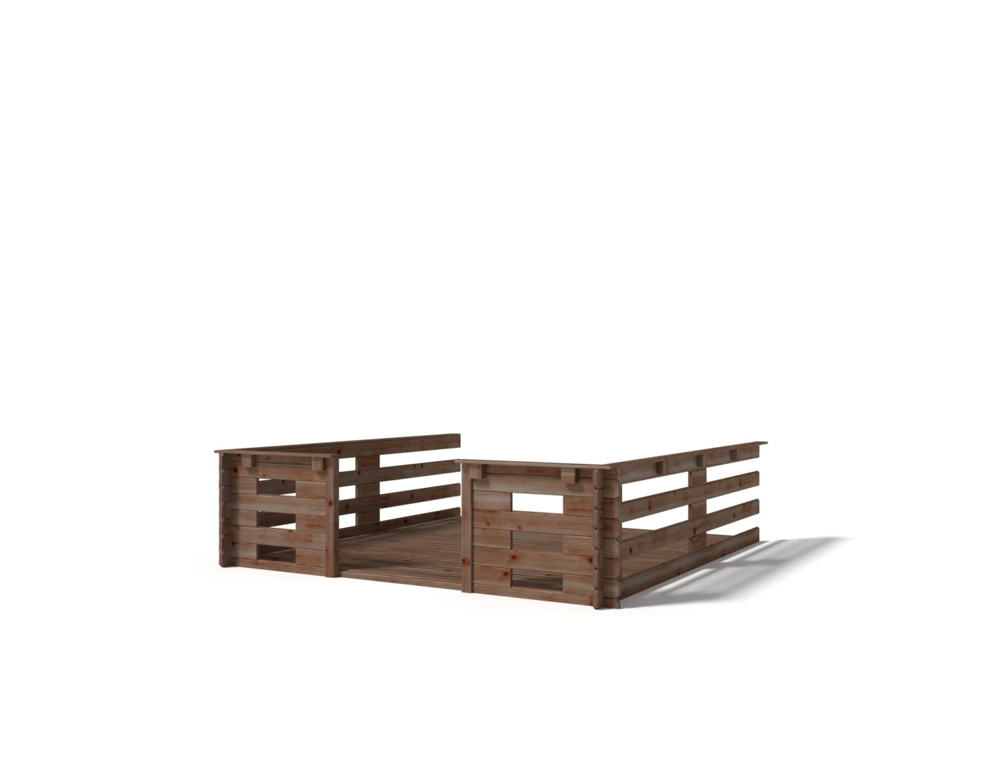 Terrasse en bois avec balustrade DOM540 d'une superficie de 9 m2, d'une largeur de 3 m et d'une profondeur de 3 m. La terrase s'adapte aux abris en bois d'une largeur de 3 m en façade et d'une épaisseur de 28 mm, proposés par ALTANKA p.s.a. Le montage avec les instructions incluses ne pose pas de problèmes.