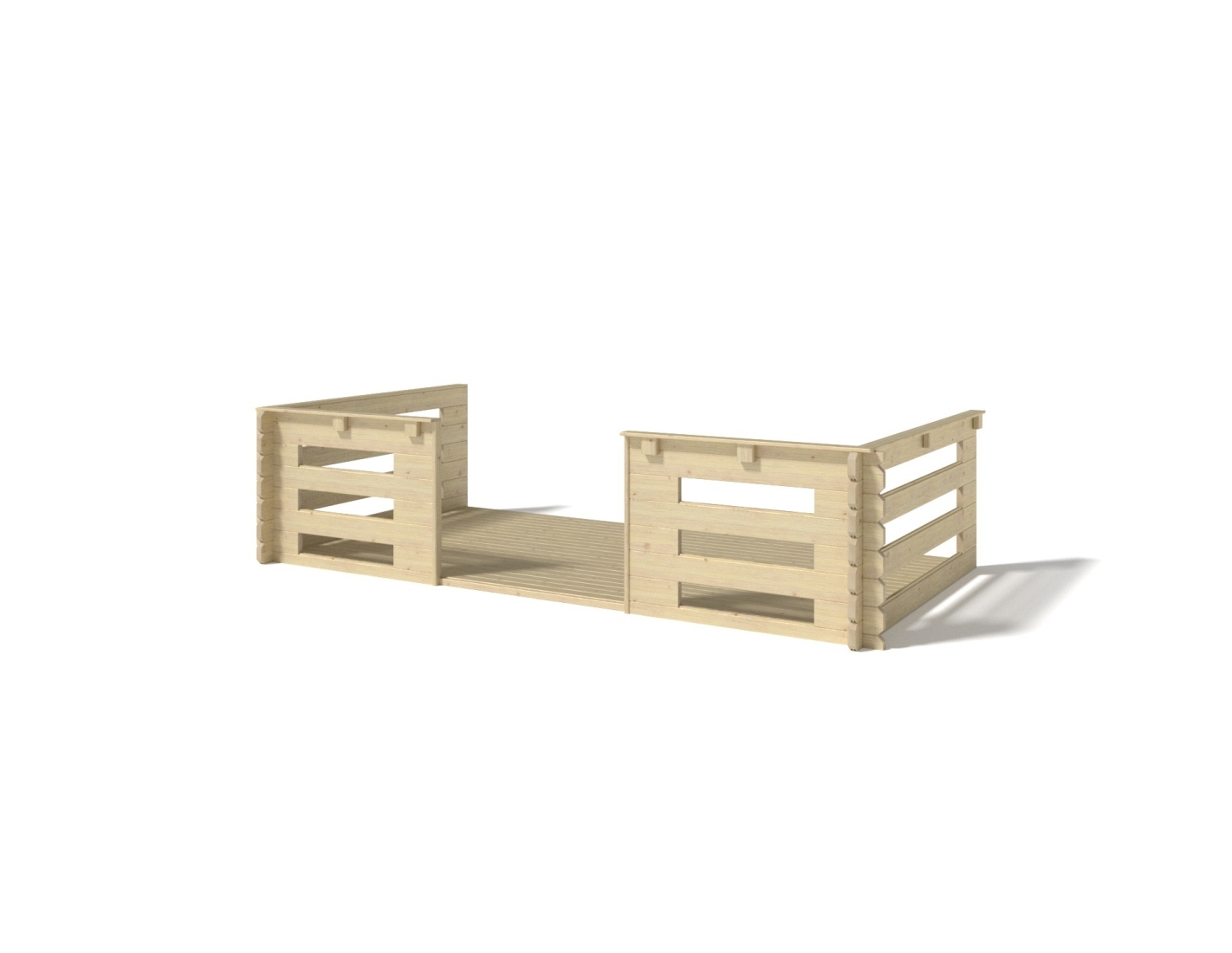 Terrasse en bois avec balustrade DOM545 d'une superficie de 8 m2, d'une largeur de 4 m et d'une profondeur de 2 m. La terrase s'adapte aux abris en bois d'une largeur de 4 m en façade et d'une épaisseur de 40 mm, proposés par ALTANKA p.s.a. Le montage avec les instructions incluses ne pose pas de problèmes.